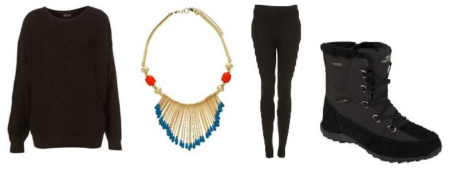 On the second evening, I wore a black version of the knitted texture jumper seen above with a vintage necklace which used to be owned by my Granny. Again I wore the jumper with tights under leggings and the black snow boots, this time without the boot cuffs. The black textured jumper is no longer available, but various other colours can be purchase from here.
