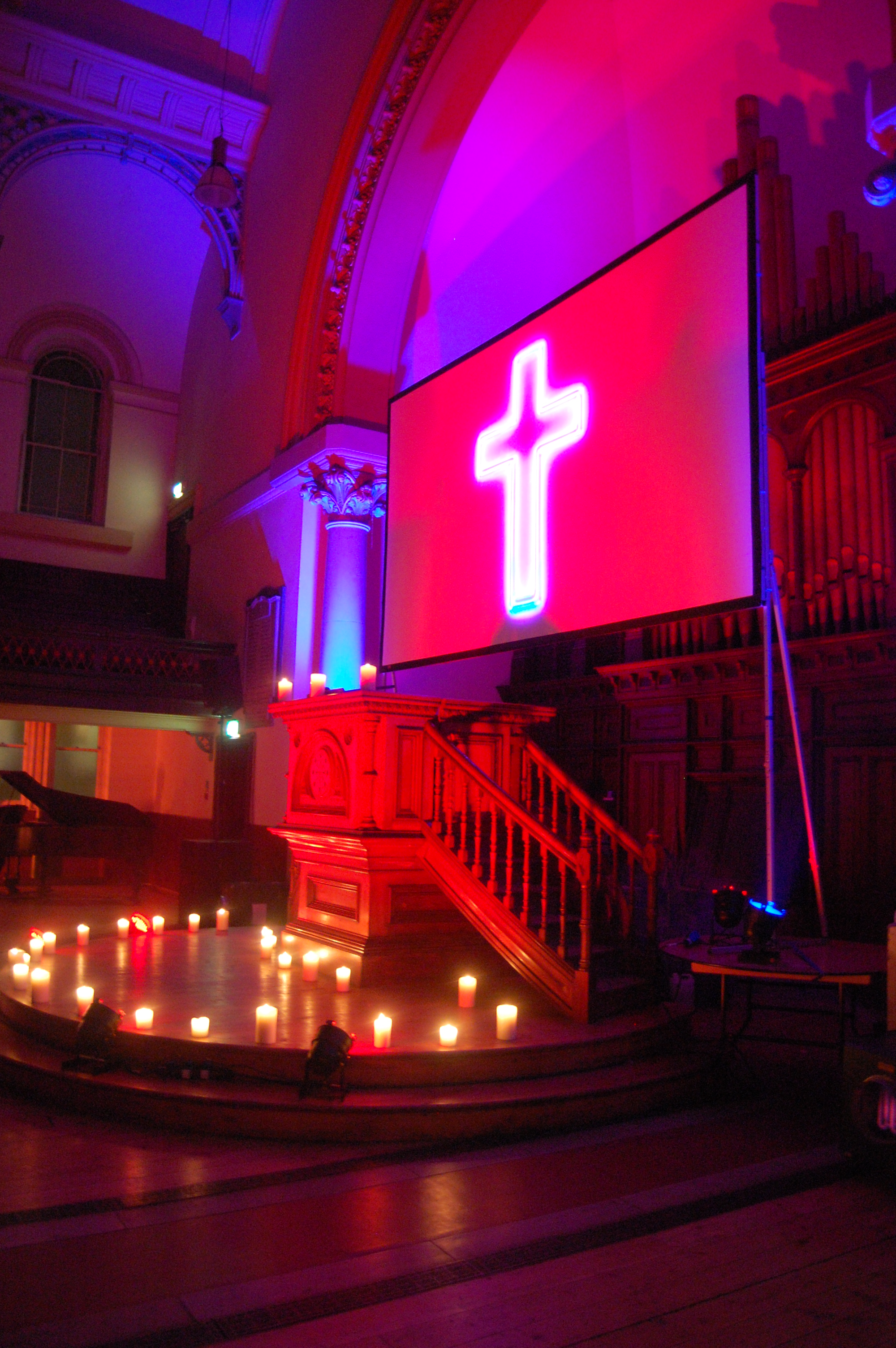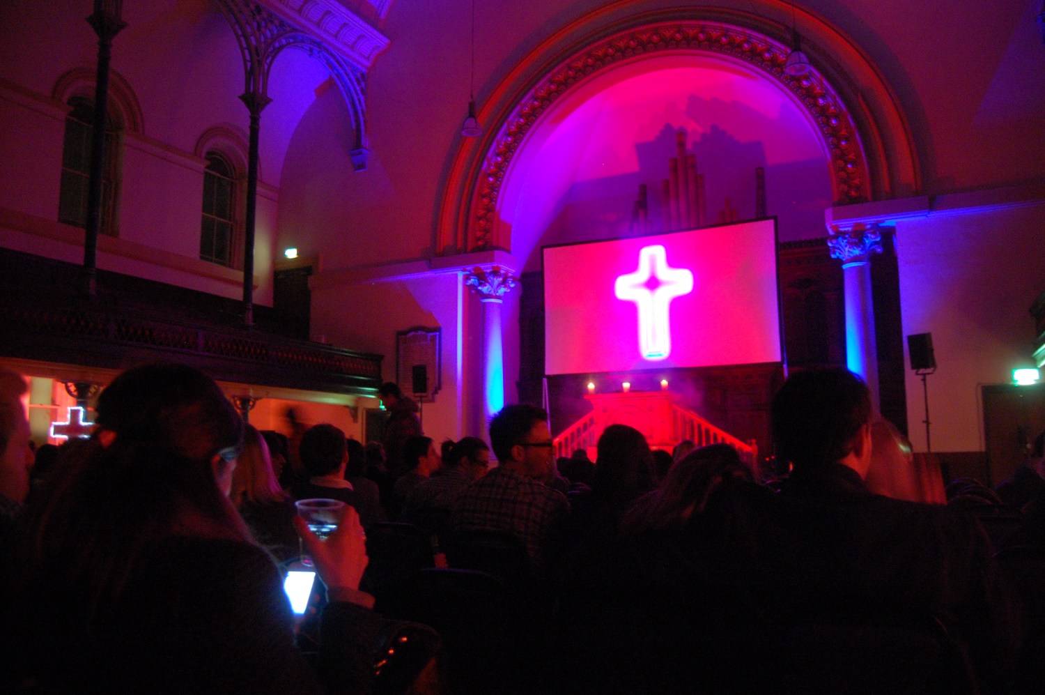 The screen was hung from above the alter, with mood lighting and an abundance of candles. Before the film began the host made an announcement from the alter welcoming us all to this evenings screening and introducing the film. To the left of the screen was a live pianist playing classical tunes on a baby grand piano. It was perfect background noise, whilst the audience chose seat, purchased drinks (from the fully licenced bar) or popcorn served by Father Ted – the waiter, dressed as a monk.