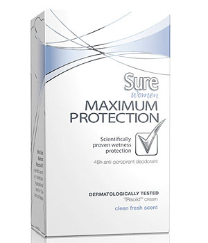 Sure Maximum Protection provides unbeatable 48-hour protection against wetness and odour. It is specially formulated for very active women, and has a reactive complex which works as hard as you do – so you remain feeling fresh, dry and fragrant even during bouts of intense physical activity. The formula is kind and gentle to skin – but is so strong it will continue protecting you even after a shower.