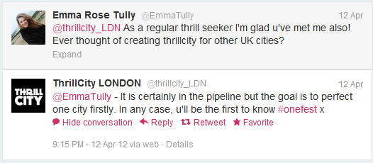 Once, I’d seen the benefits of following brands and people I was interested I started to actively seek Twitter accounts for websites that I regularly visit. One of my favourite sites at the moment is Thrill City.
