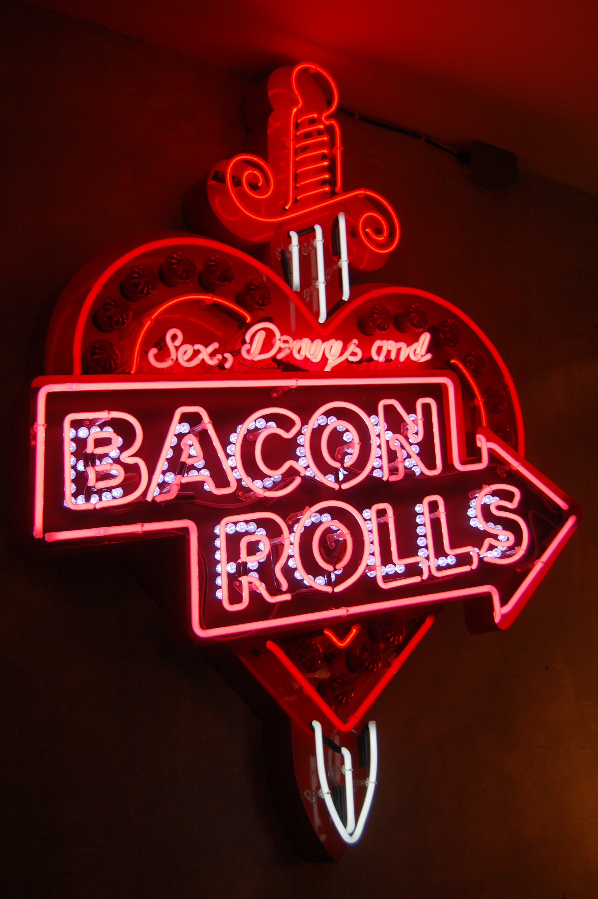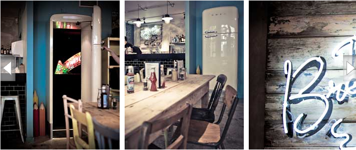Timeout.com writes “Breakfast Club’s Spitalfields branch resembles a cool version of an American burger bar: faux tin ceiling, ‘booths’ created from a row of reclaimed locker-room seats, zinc bar stools around original brick columns, and walls covered in eclectic memorabilia and signage, including a neon ‘Sex and Drugs and Bacon Rolls’. There’s a real sense of fun here – even the loos have My Little Pony wallpaper – and, on the night of our visit, the mainly suited crowd clearly enjoyed the buzzy atmosphere”.
