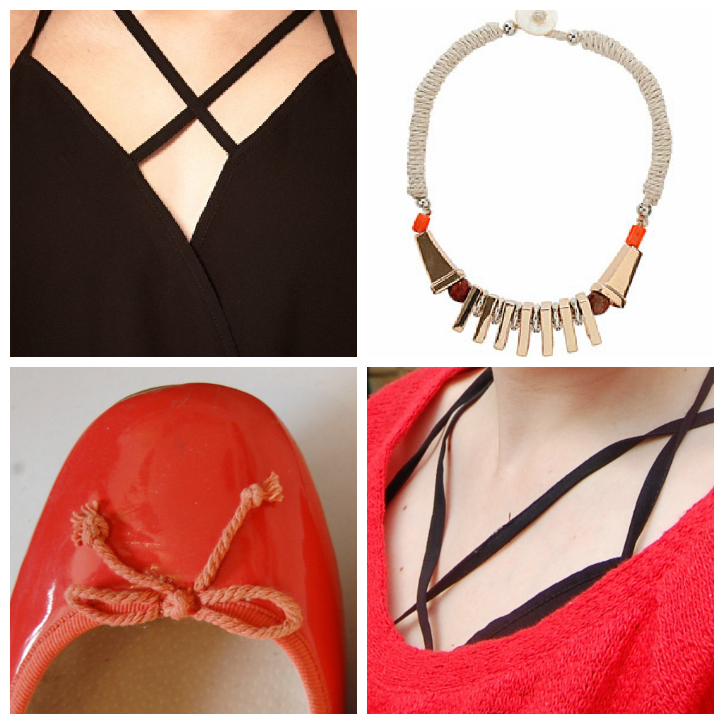 Items ASOS Playsuit with Strappy Back (same as above), Topshop Square Cord Necklace, Accessorize Coral Prima Patent Ballerina and Zara Trafaluc Coral Knitwear.