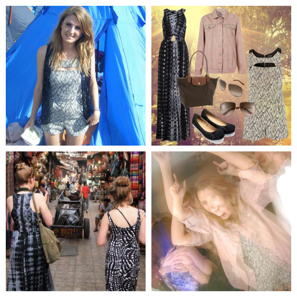 Verdict I absolutely love the Tie Dye Maxi Dress from Topshop, the wrap front with concealed zip fitted so nicely and was so comfortable to wear. I think the design of the dress suits flat chested girls otherwise the gaps in the front tend to widen and don’t look so good, for me the dress works best bra-less. As a  compromise for the Longchamp, I found a beautiful suede and leather workbag from Topshop in Khaki green. It’s was the perfect hand luggage size for my trip to Morocco and ideal for day trips as it holds my SLR camera. The Jacquard Cut Out Playsuit is also another recent favourite of mine, it fits so nicely although I would say draws attention to the stomach – breath in and it looks great. I’ve worn it on a few nights out now, the first being at our house party we hosted in May (bottom right image) and most recently at Global Gathering festival with my Oliver James Vintage Sequin Waistcoat (top left image), I picked up at Latitude festival in 2008.