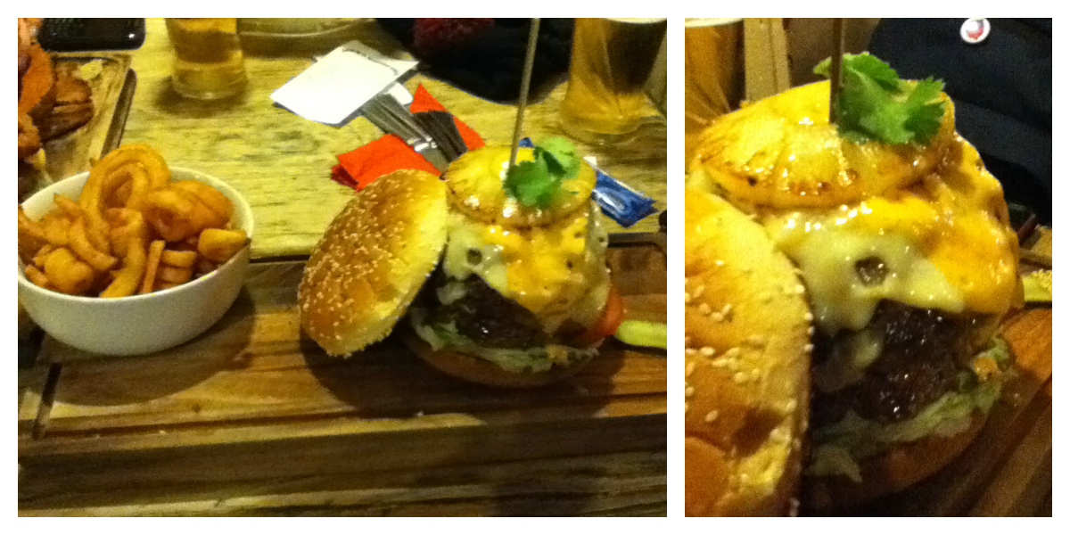 The ‘Boston Nibbler’, also a beef but x2 burgers, came with Swiss and Cheddar cheese melted on the top of two bacon rashers, taggy american burger sauce, a slice of grilled pineapple and onion rings – yeah, it was a whooper! I tasted a few of the curly fries, which were great and a very decent portion size. As this burger was so huge, my dinning partner split it in two, using the top of the bun as a base for the second beef burger. His only criticism was that the bread bun was dry, which is interesting considering that was my only complaint also – maybe it wasn’t just the lack of mayo! But he did say that the American style burger sauce was amazing. So all in all, both our burgers receive a thumbs up.