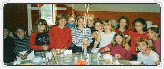 Ceramics cafés were a popular birthday party location when I was a child, below is an old photo from my twelfth (or maybe thirteenth?) birthday party at All Fired Up, Ipswich. I’m the one in the stripy top in the centre of the pic – how cute!