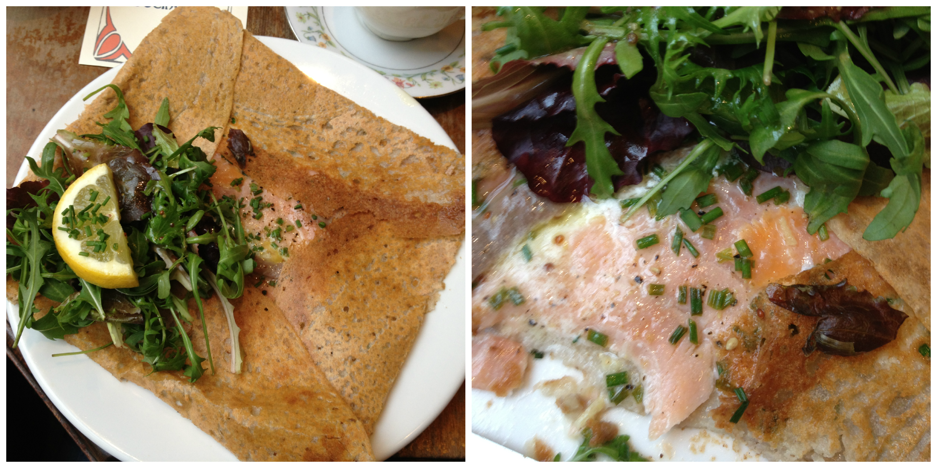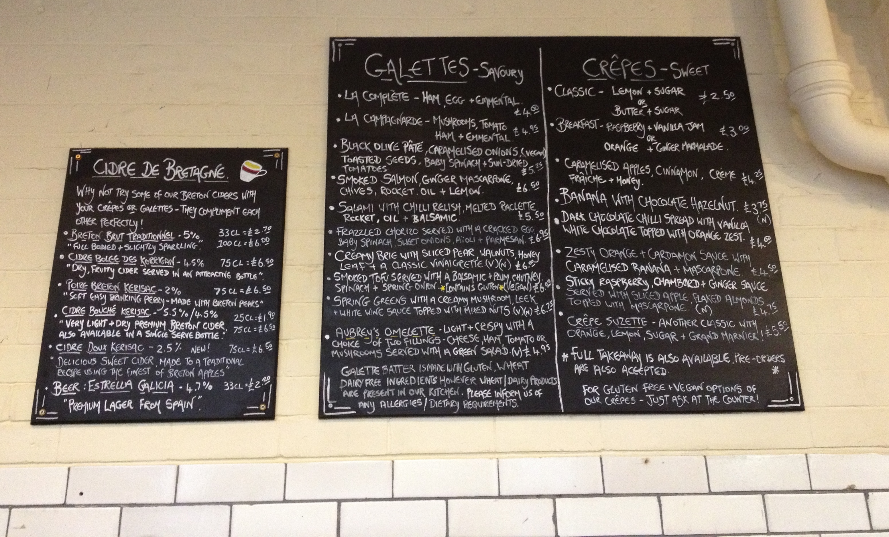The main menu is inscribed on a blackboard displayed on the wall, where you’ll find a list of Cidre de Bretagne, and the Galettes (savoury) and Crepes (sweets) on offer. Galettes are made from buckwheat flour and the Crepes from gluten free wheat, in both cases wheat-free and vegan options are available, as well as dairy free ingredients (fillings).
