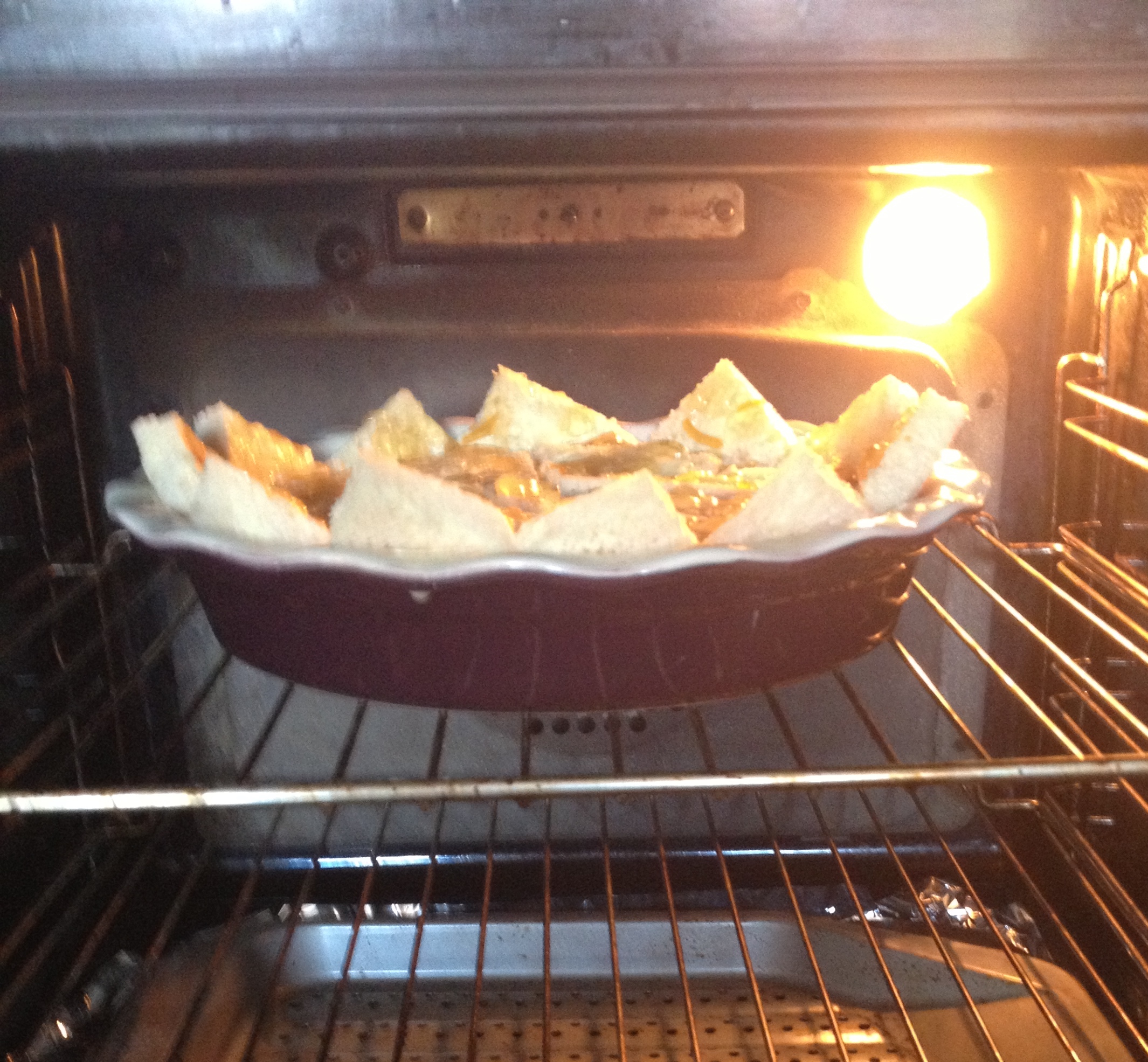 Spread each triangle with a little marmalade. Butter your pie dish and line the base with about 12 of the bread triangles, butter side up. You should have about 2-3 layers.