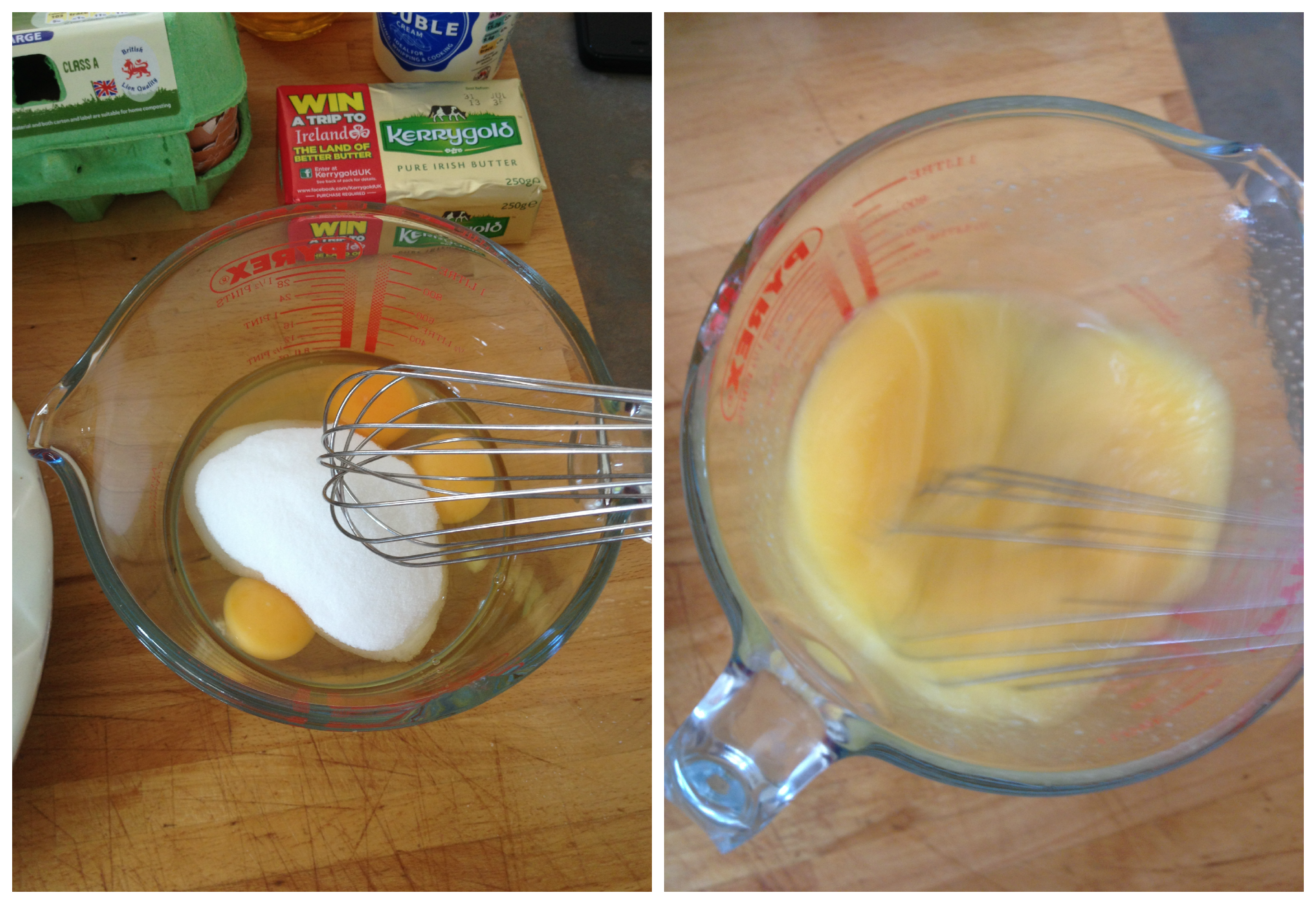 Crack the eggs into a large jug and add the 100g of sugar. Beat, using a whisk or fork until smooth.