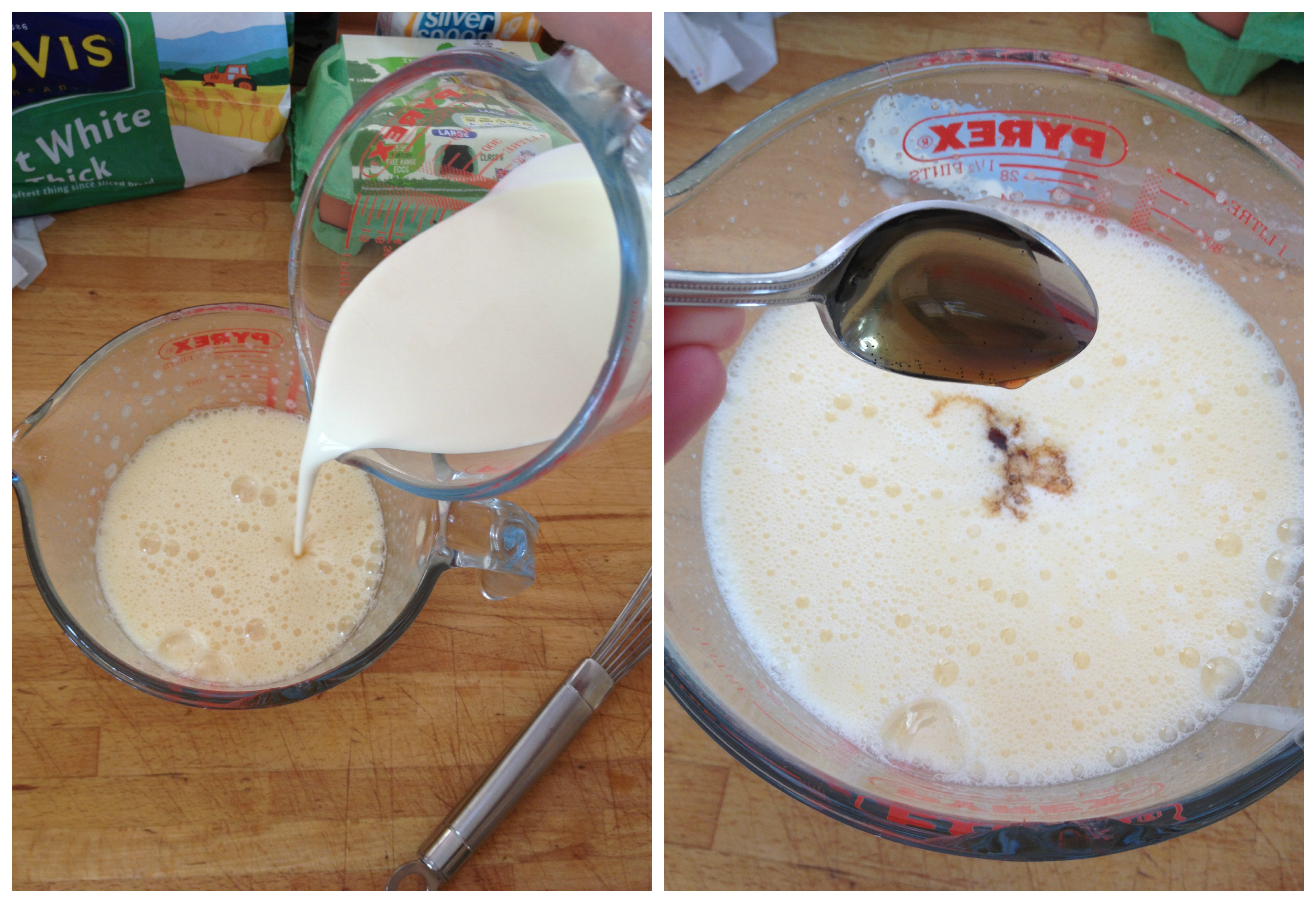Add in the 200ml of double cream, 200ml of semi-skimmed milk and half a teaspoon of vanilla extract and stir. Set aside and move onto step 3.