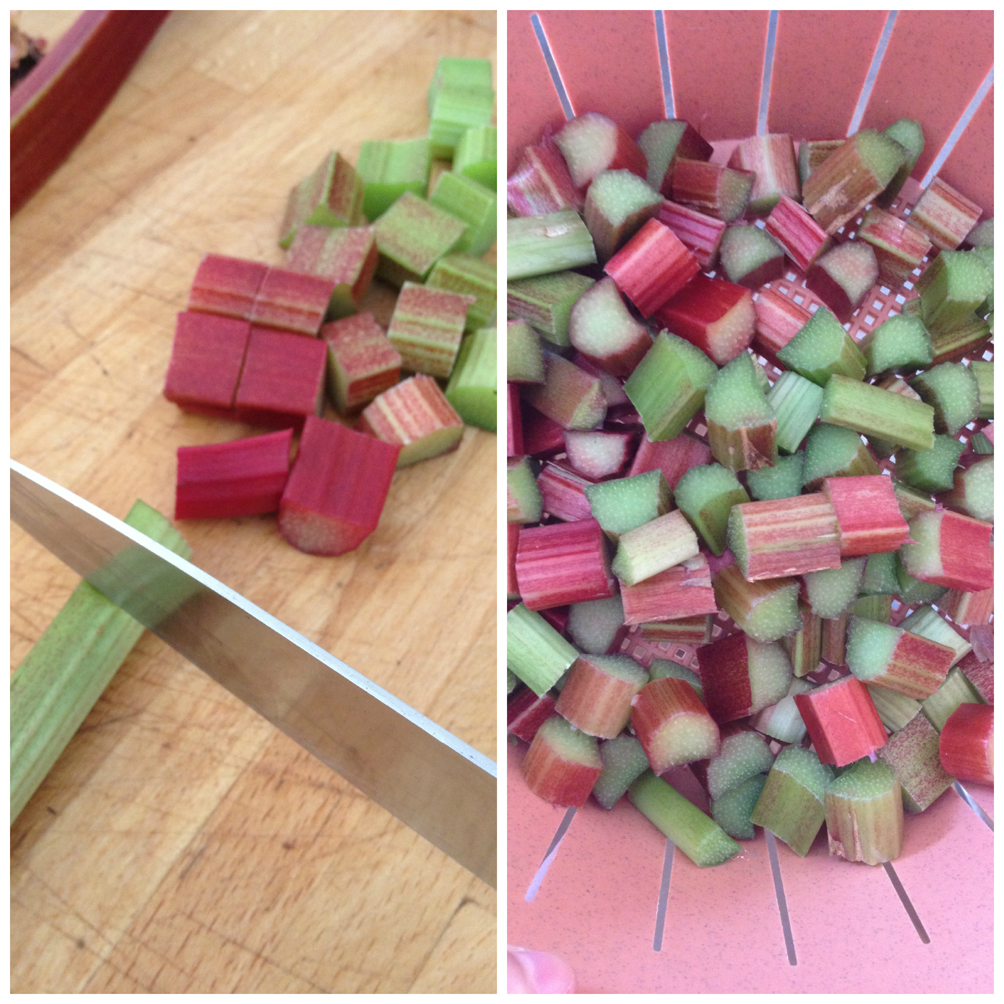 Cut your rhubarb into 2 cm lengths, add them to a colander and wash under tap water.