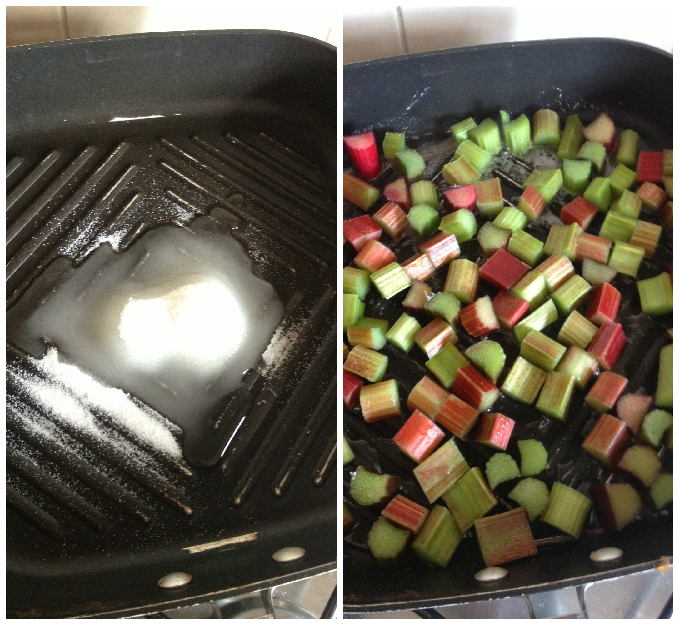 Add 1 tbsp of water and 50g of caster sugar to a non-stick frying pan over a low heat. Add the rhubarb and cook gently for about 6-8 minutes making sure you turn them over using a spatula to ensure both sides are cooked.