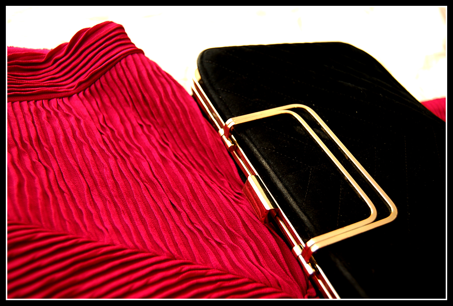 - Necklace – Diva by Miss Selfridge. Adding a black and gold necklace links the whole outfit together matching the bag and shoes with the magenta dress.