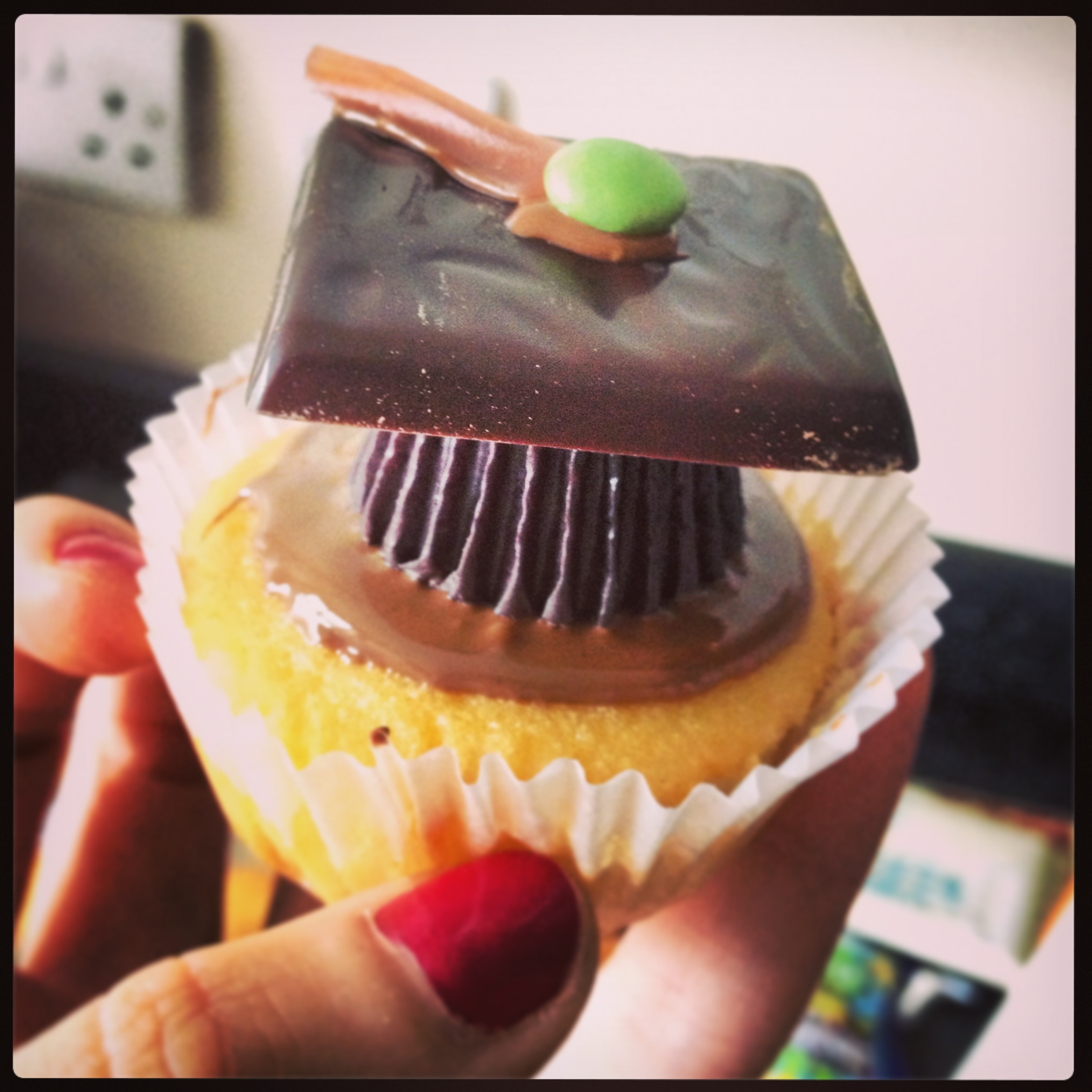 4. Let the chocolate set by leaving for 1 hour at room temperature or for 15 minutes in the fridge and there you have it! Some very easy to make Mortar Board Graduation Cakes! Enjoy the strange combination of Peanut Butter and Mint flavours… Comment below if you have any other suggestions for ingredients. Happy Graduating y’all!