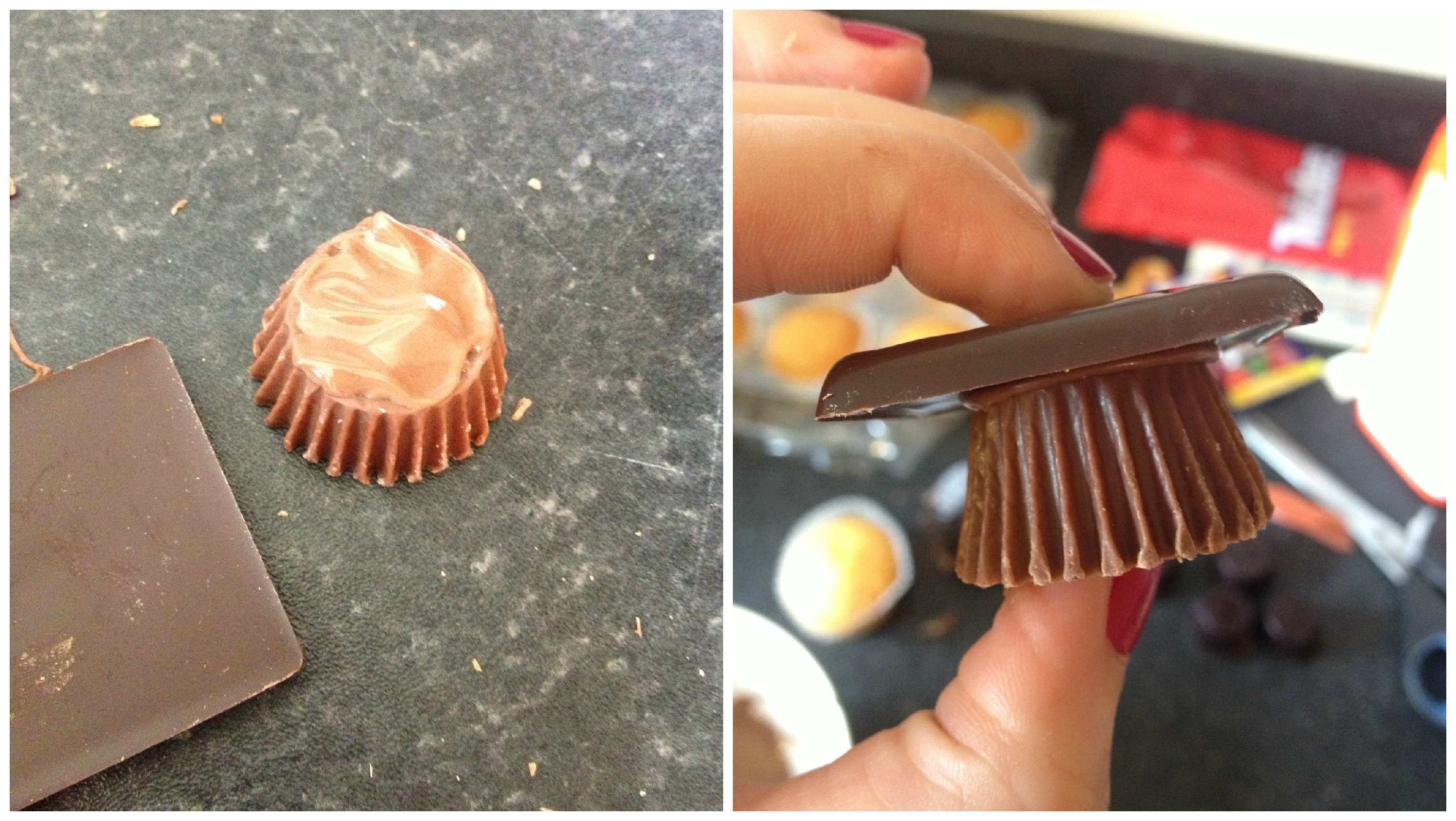 2. It’s easiest to make the Mortar Board hats first and then add them onto the cupcake base. Start by adding a layer of melted chocolate to the base of the Reece’s Peanut Butter Cup and placing the After Eight chocolate on top. Hold and let them stick together.