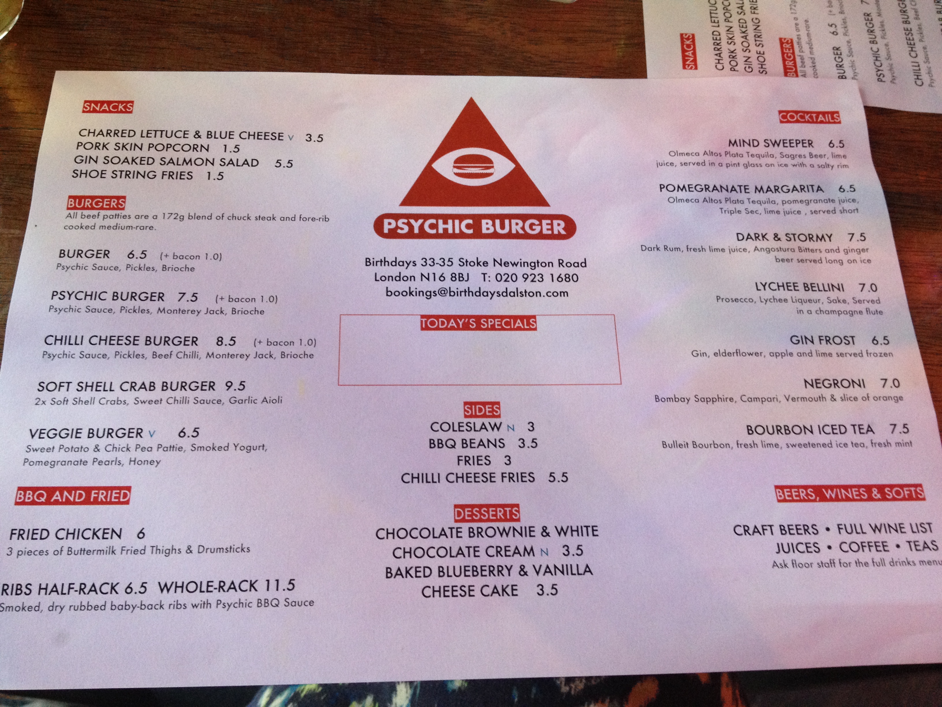 Adiós to Rita’s Bar & Dining meant Hola to Birthdays‘ brand new diner Psychic Burger. With a relatively small menu, it was a great spot for my first food review since my return to London. Entering into the east London burger arms-race, Psychic has positioned itself in a market with tough competition. So what’s their secret weapon? It has to be the Crab burger. Light and sweet, crab burgers are perfect summer food. Their white flesh is cheaper than lobster, though just as tasty, and full of omega-3 fatty acids (Butter, 2013). The Evening Standard lists Psychic’s Crab Burger as one of the top five finest catches in London.