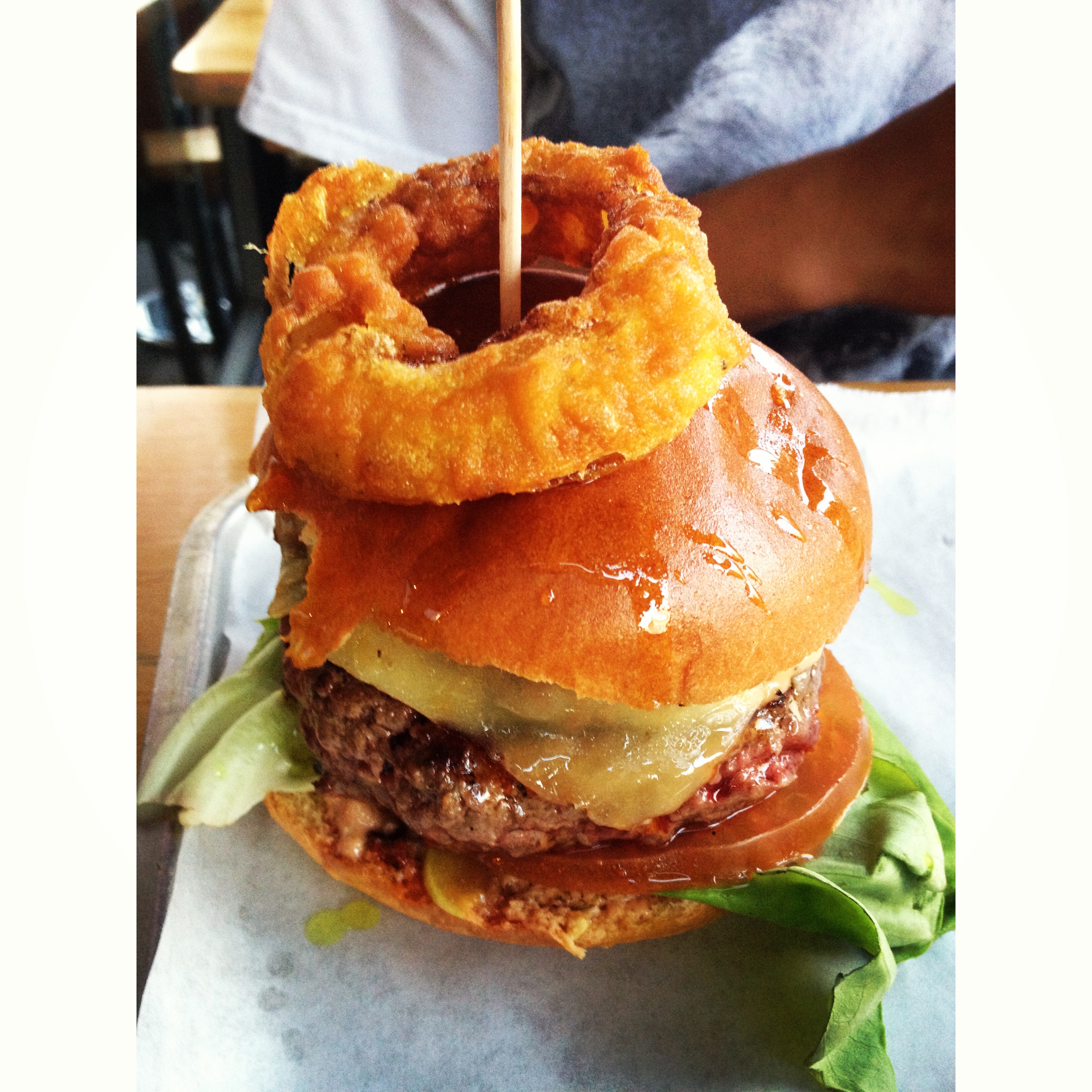 Next, I introduce to you the Soft Shell Crab Burger, deep-fried crab, served in a brioche bun with smoked garlic aïoli, sweet chilli sauce and an onion ring on top.