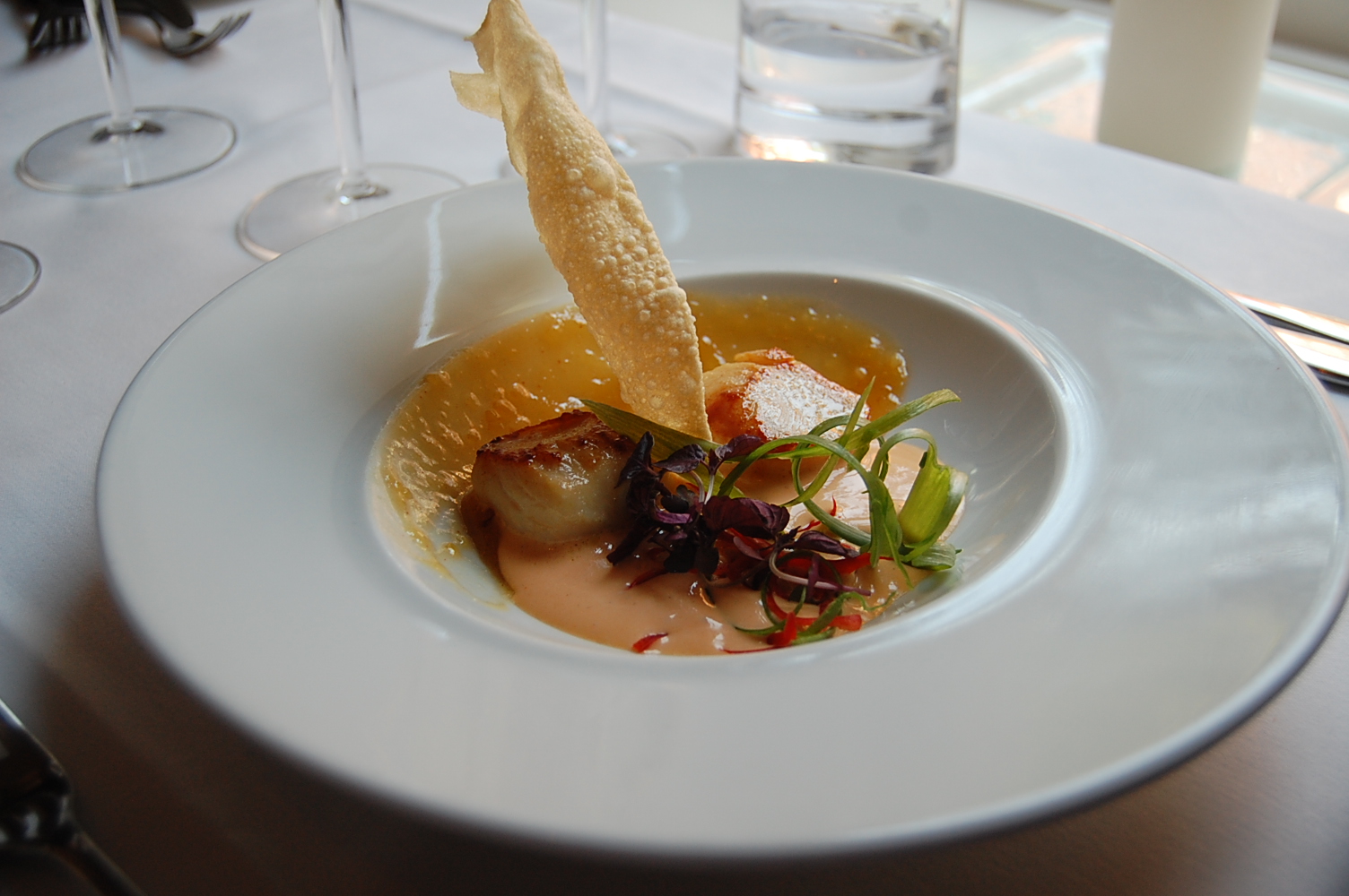 With white linen table cloths, dramatic wallpaper and opulent chandeliers, the Blenheim room was a beautiful setting for our evening meal. Having placed our order whilst we were sat outside it wasn’t long until our starters arrived. Three out of the six of us dining ordered the Curried Scallops with Mango Chutney, Shiso and Poppodom (£13.50) which looked fantastic. I had a small taster and have to say it was delicious – the scallops were warm and soft and the curry was mild and creamy with a lemony tang.