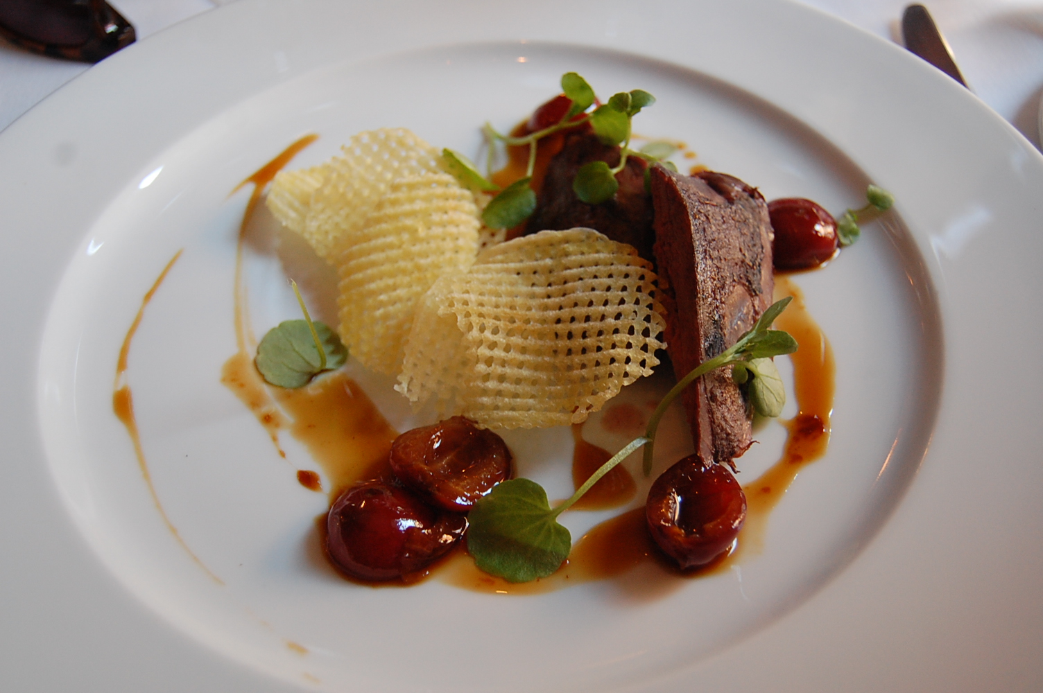 I chose the Vale of Belvoir Wild Wood Pigeon (served pink) with Black Cherries, Game Crisps and Watercress (£10.50) for my starter. According to BBC food (2013) wood pigeons are generally considered the tastiest and meatiest of all the pigeons, best served pan-fired and pink. This pink pigeon didn’t disappoint, it went very well with the juicy black cherries, peppery watercress leaves and salty game crisps. It looked and tasted like a masterpiece.