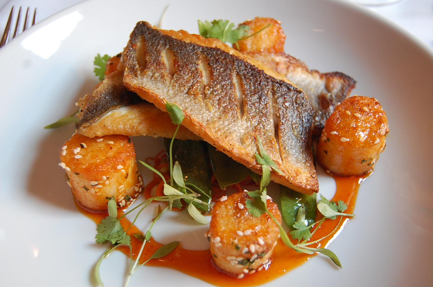 For the main course, the Pan Fried Sea Bass was another popular choice on our table with 3 of us selecting it from the menu. The Pan Fried Sea Bass was served with Crispy Rice Cakes, Mangetout, Spring Onion and Chilli (£18.95). Now this is a dish worth breaking down (as best I can). It reminded me of Pan–Asian cuisine, the crispy rice cakes were like creamed potato rolled in sesame seeds and chilli oil. They were spicy but sweet and sticky. The fish was delicious, the skin was salty and crispy and the white meat was moist and flavoursome. Presented on a bed of mangetout, it had to be my favourite dish of the day. It was so good, I hope that description gives it the justice it deserves.