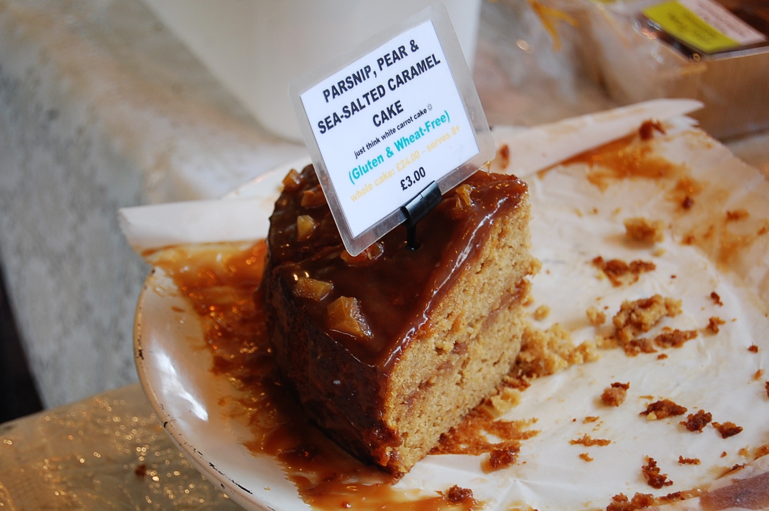 In the end we decided to go for something unusual, a slice of Parsnip, Pear & Sea-Salted Caramel Cake. It was mouthwateringly good, moist sponge, sweet stinky caramel topping with dried pear fruits decorating the inside. Gorgeous!