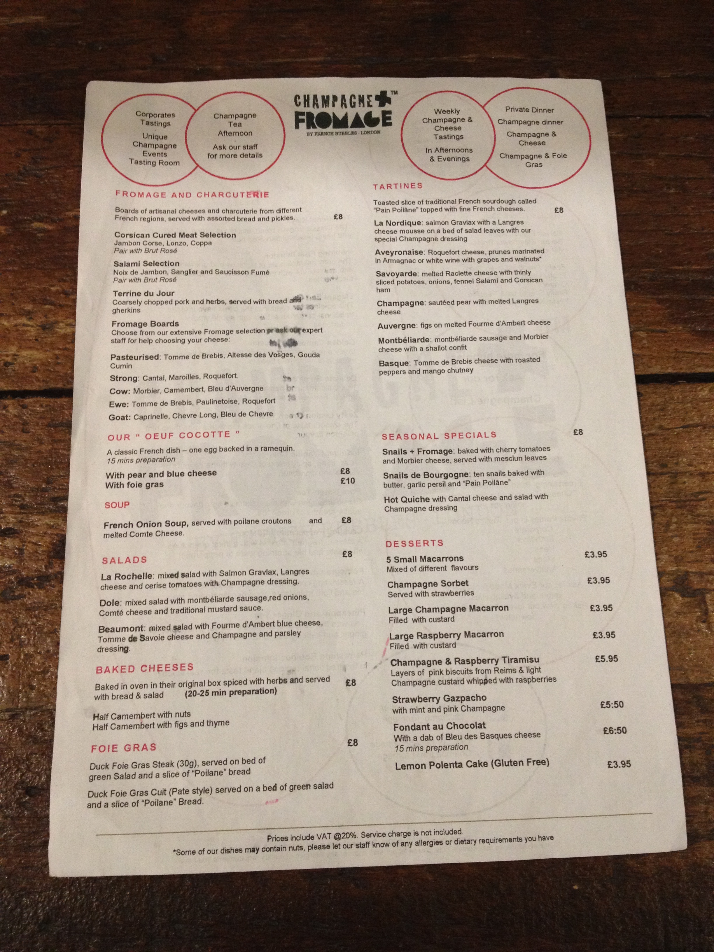 I went on a Thursday evening with two friends, we met there for around 7 which was a good time, any later and we may have struggled to get a place. More interested in sampling the cheese than the champagne it was a bit of a shame that no other alcohol apart from champagne is available (clue is in the name I suppose). With the cheapest glass setting you back £9 we opted for a glass of Elderflower Presse instead of a Kir Royal!