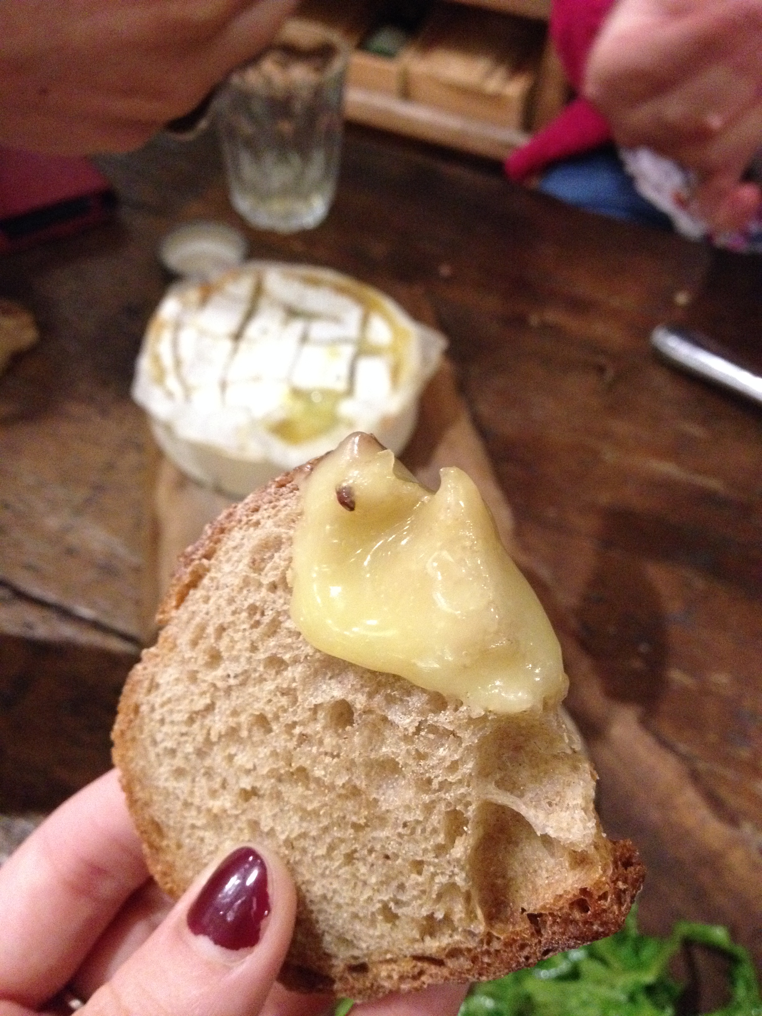 Swiftly after devouring our first platter (sorry, did I say that we politely helped ourselves?) the Camembert arrived. Oven baked in its own original box and spiced with herbs, I give you the Camembert with figs and thyme.