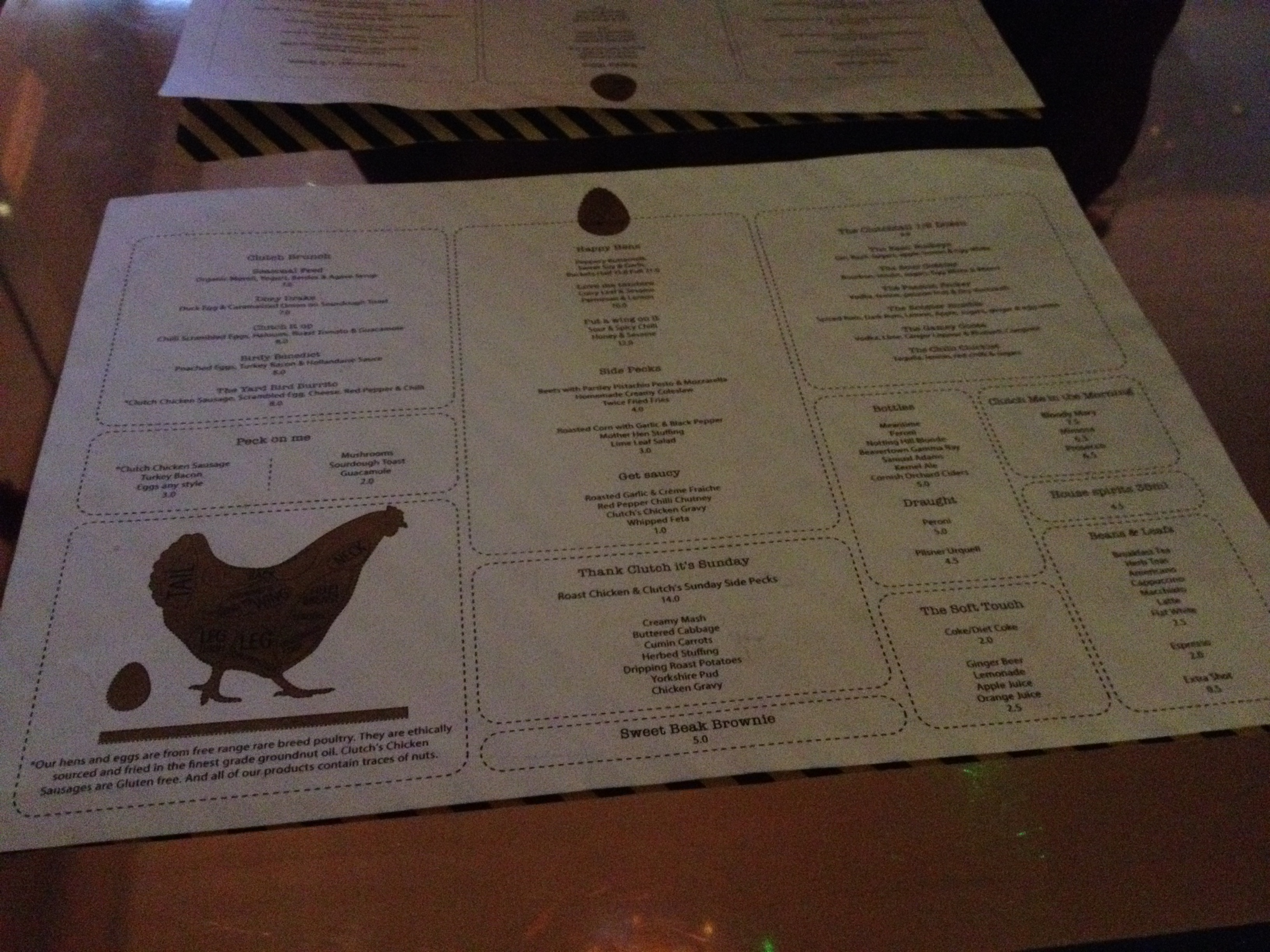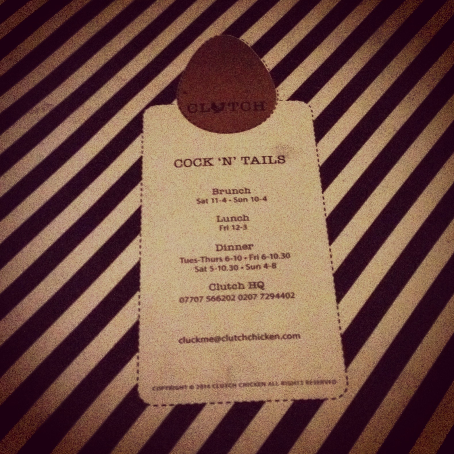 A chicken restaurant where there’s more bird-related puns on the menu than you can shake your tail feathers at. Family-run Clutch, opened it’s doors to the (empty) street of Ravenscroft Road back in November last year. Close to East London’s Hoxton, but hidden away from the passer-by, I suspect most Clutch diners have heard about it before walking through the doors of their coop.