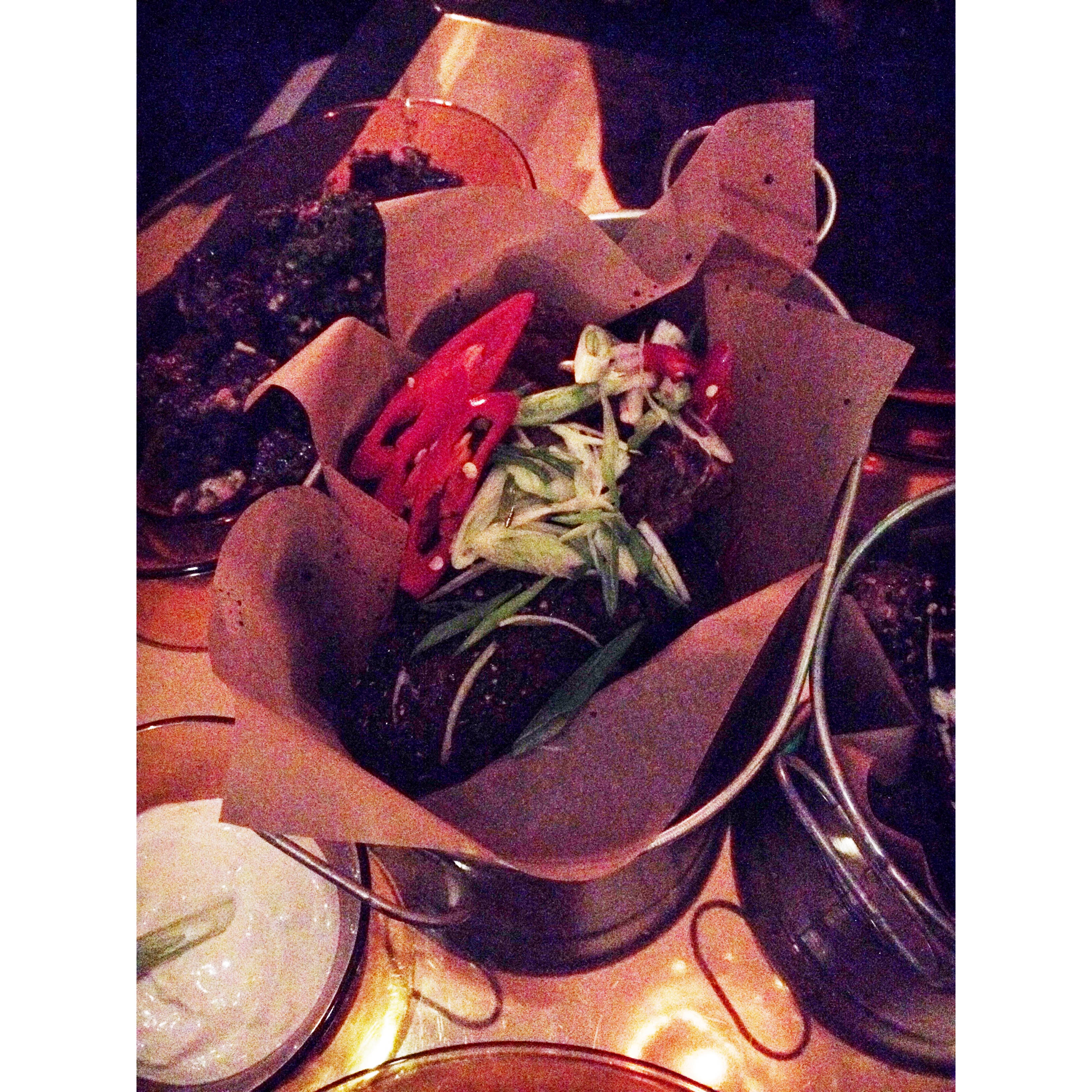 For sides, we ordered the Twice Fried Fries which were a decent sized portion for two – especially with everything else we’d ordered! They were delish, crispy on the outside, fluffy on the inside. We also went for the slightly more adventurous Beets with Parsley Pistachio Pesto & Mozzarella. The foodie pic I took is just a big dark splodge, so you’ll have to use your imagination with this one. Chunks of beetroot filled the bottom of the dish which were covered with oily pesto, crushed pistachio nuts and mozzarella. It was a cold dish – which tasted okay, I didn’t feel it complimented the rest of the meal much so it did get a little neglected on the table.