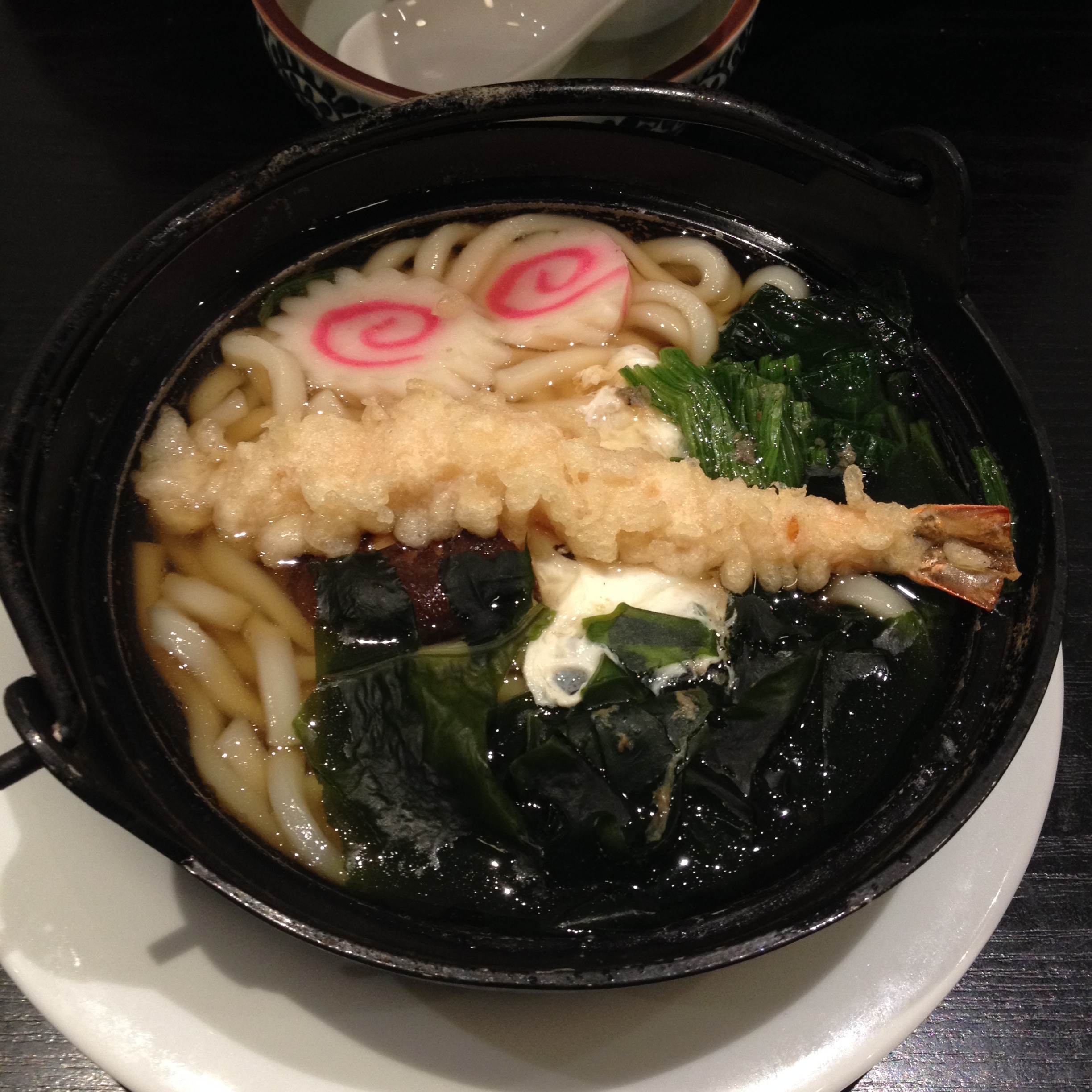 The finale of our Nambu-Tei meal was a big bowl of udon soup. I can’t remember what the actual dish we chose was called, but it included udon (a type of thick wheat flour noodle), seaweed, a poached egg, battered king prawn and naruto (which is identifiable by the pink spiral in it).