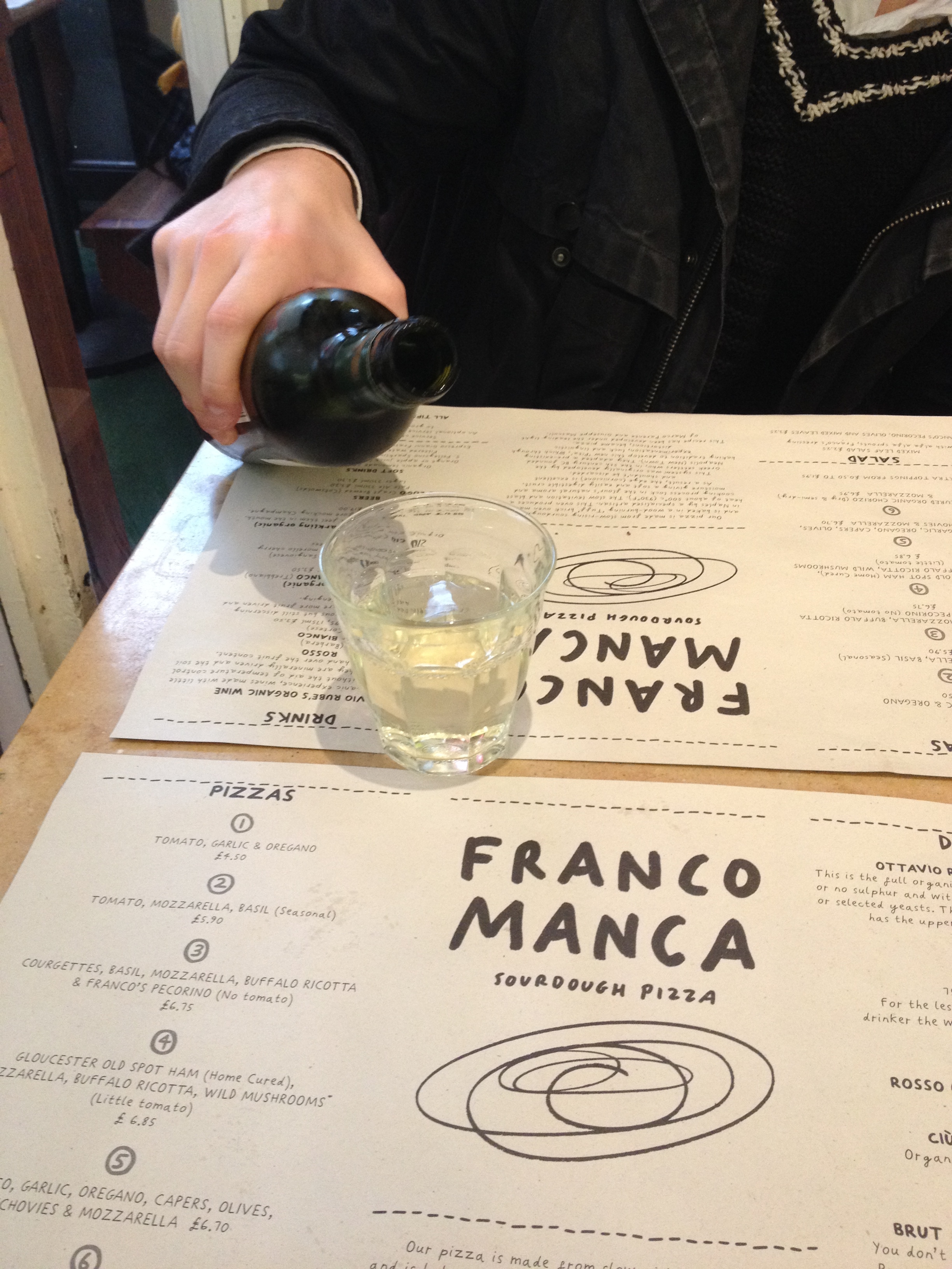 Madregale Bianco Franco Manca Franco MancaTo start things off my dining partner and I ordered a bottle of Madregale Bianco, an organic white wine from Italy produced by Cantina Tollo. Drinking from our tumblers we discussed how it had a distinct “organic taste” – crisp, fresh and fruity. Is it obvious we know nothing about wine?!