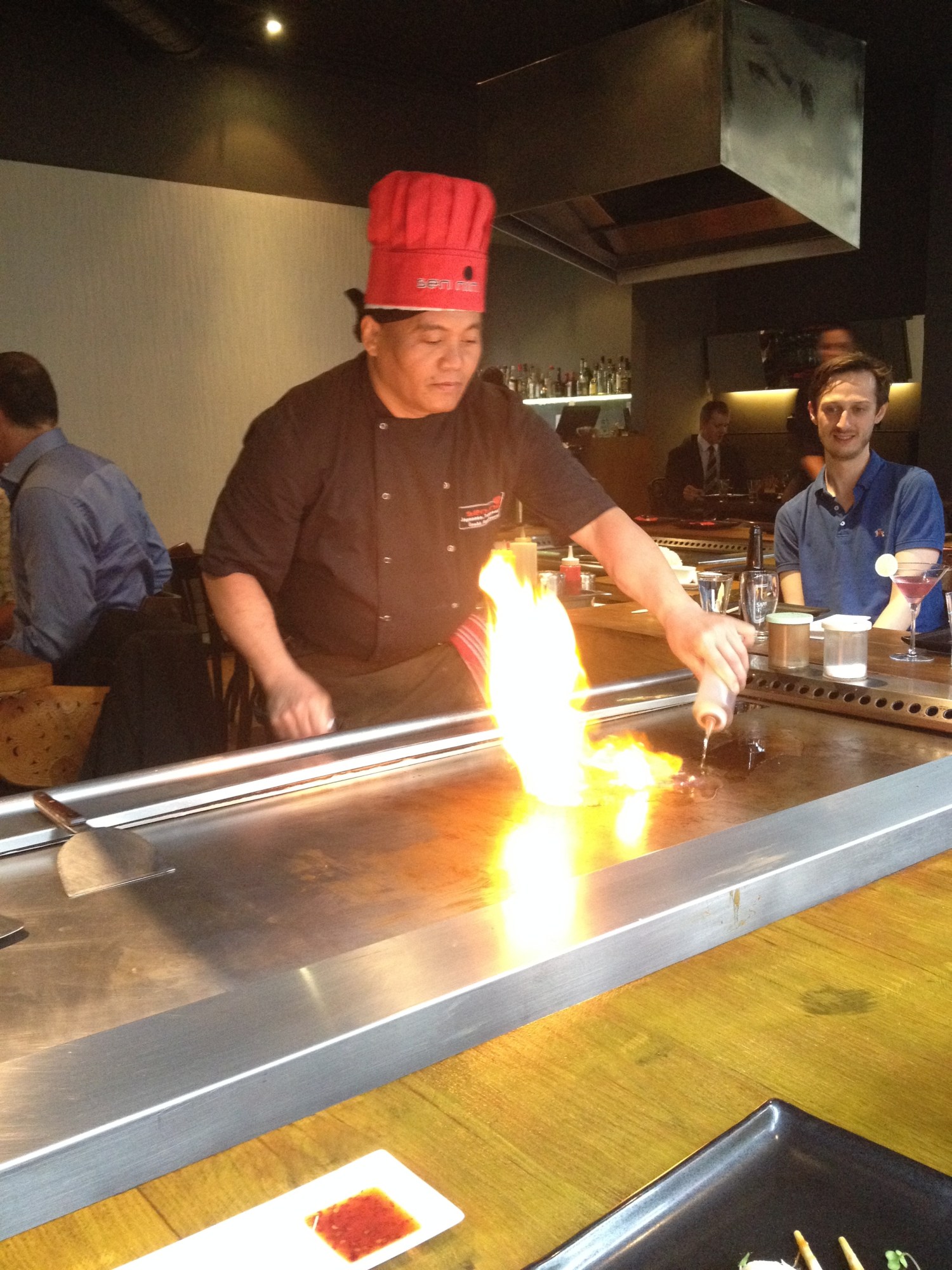 For those of you unfamiliar with teppanyaki-style eating it basically involves guests being seated around a large hot-plate (also known as a teppan or Hibachi grill). “Theatrical” chefs then take centre stage and whirl, juggle, flip and flame raw ingredients into different dishes. The point is to engage and entertain all the guests whilst they prepare your meal making for a lively dining experience!