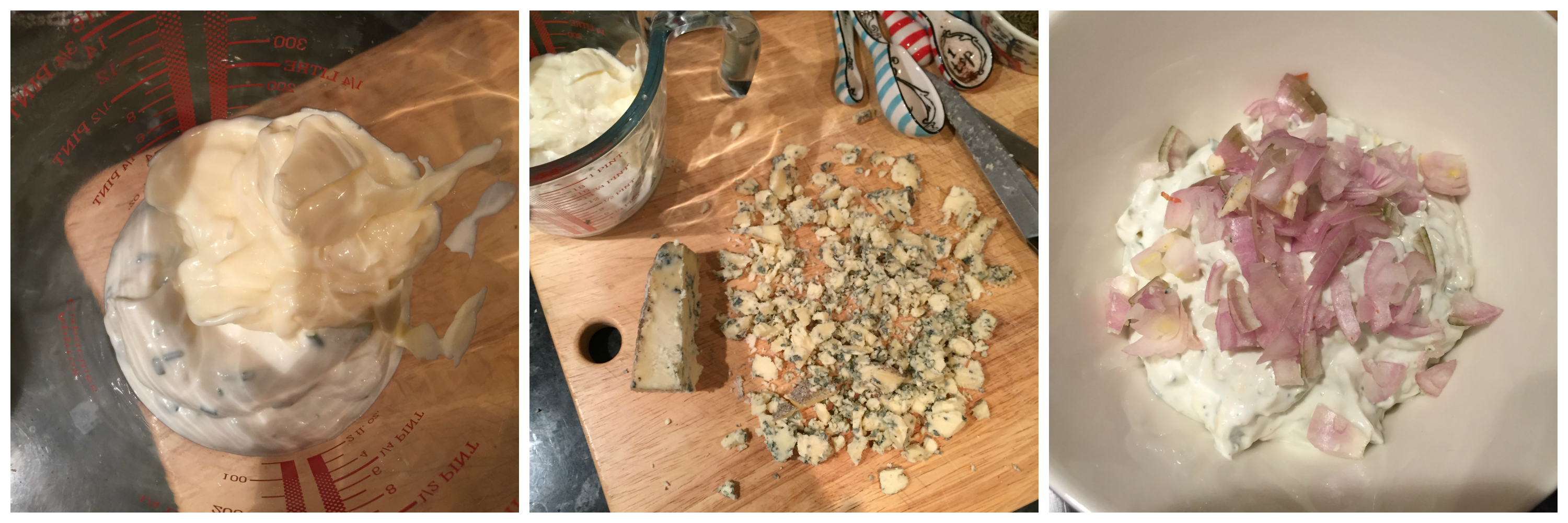 To make the blue cheese dressing mix the soured cream, mayonnaise and roughly chopped blue cheese together until smooth. Add the finely chopped shallot and stir. Set aside.