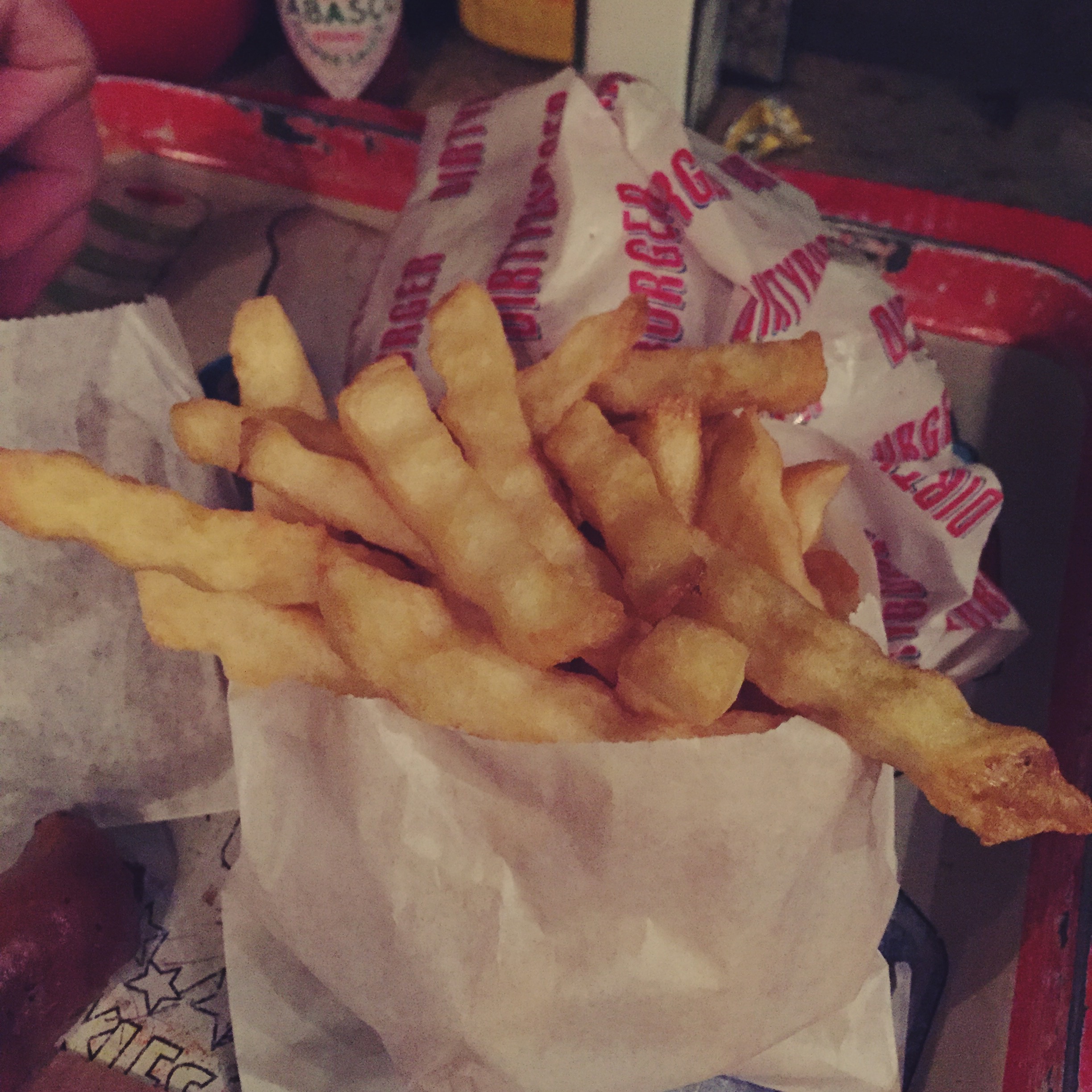 The menu is pretty basic, offering only cheese or cheese & bacon burgers, fries and onion rings. We ordered one of each, upgrading our burgers to doubles for an extra £2.