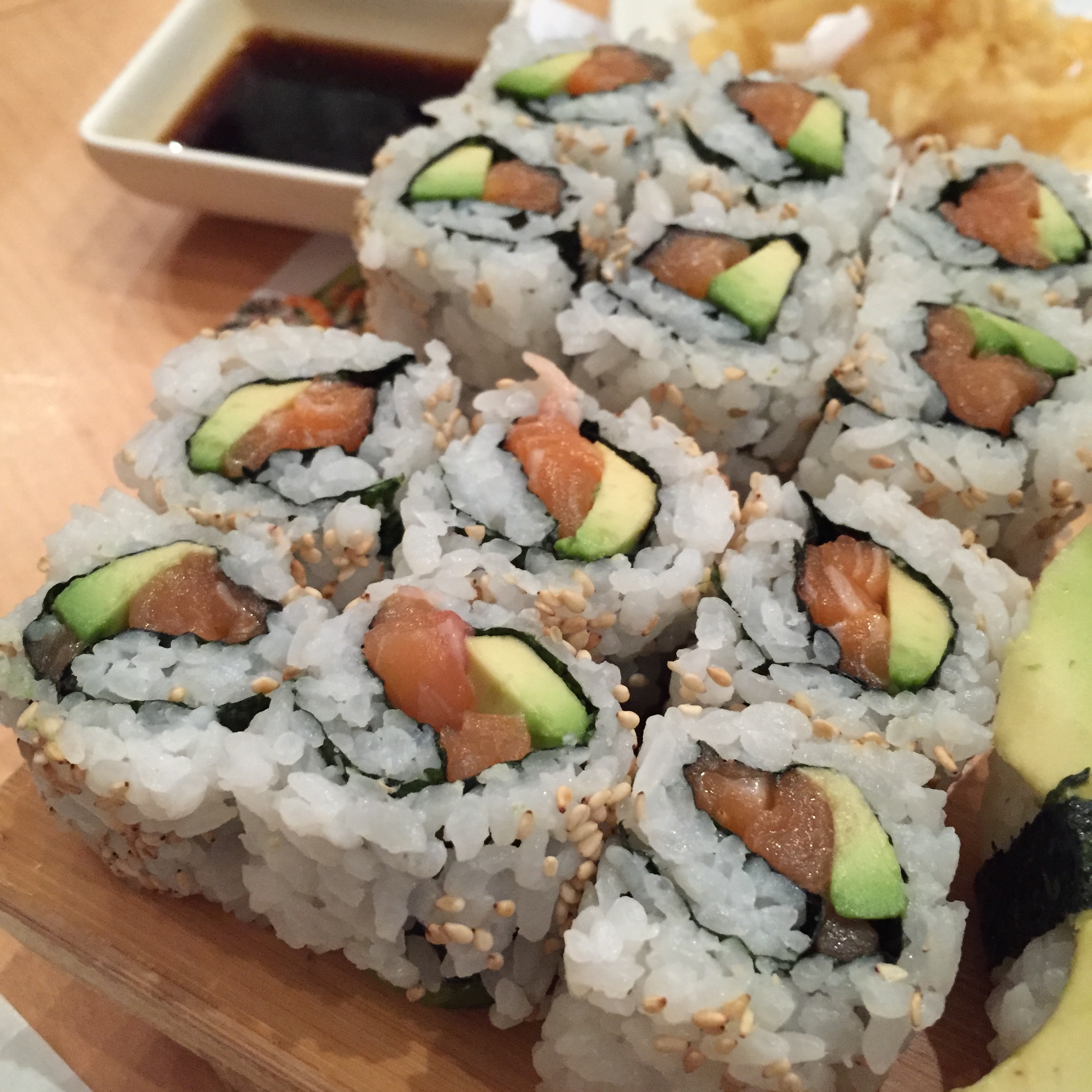 I didn’t go to the effort of photographing everything that came to the table as there really was loads! Platters of sushi rolls followed, including salmon, tuna, cucumber and uramaki (inside-out rolls) filled with avocado, crispy salmon skin, spicy tuna and even salmon nigiri.