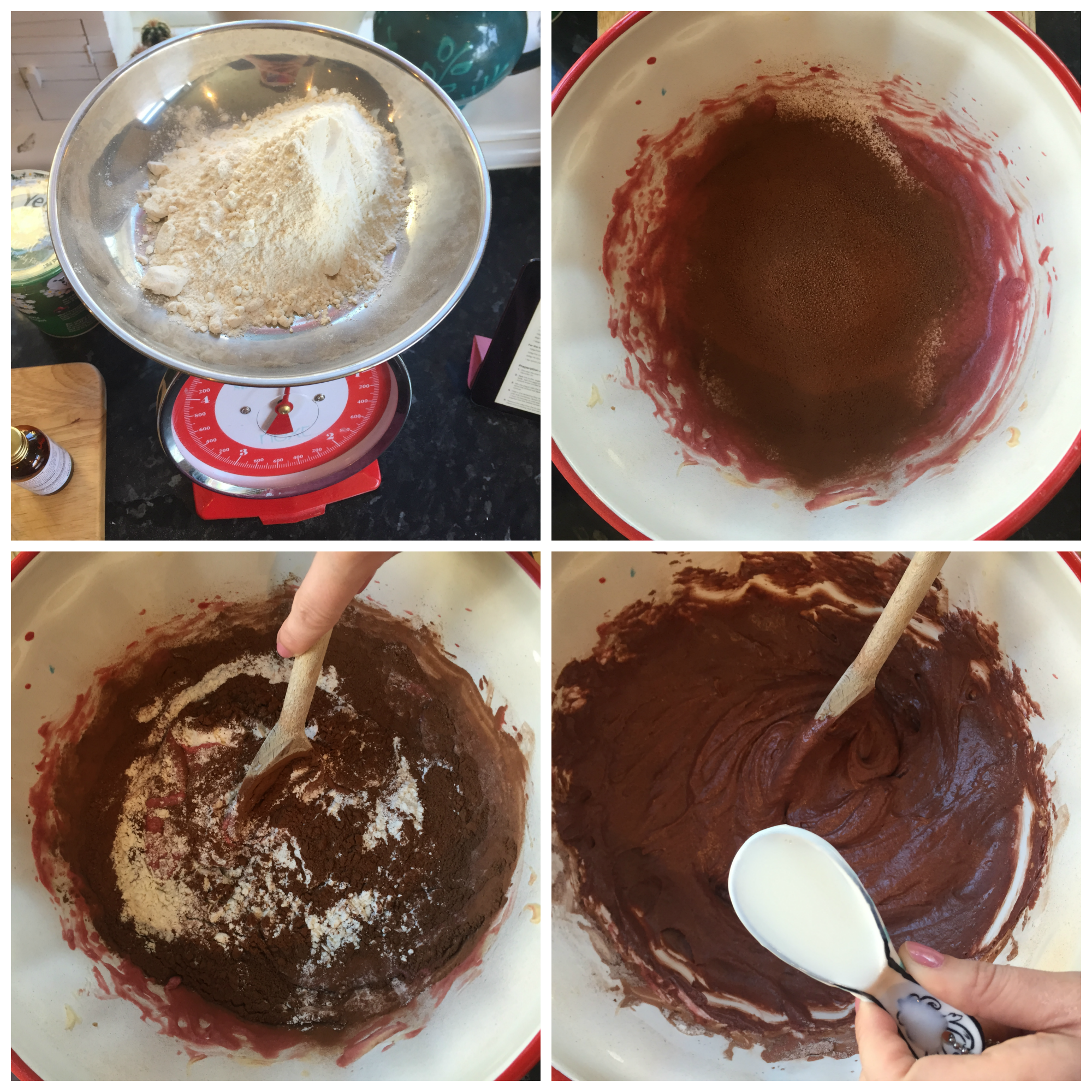 In another mixing bowl add four tablespoons of Greek yogurt and a generous glug of food colouring. You want it to look very, very red since the mixture will fade once cooked. Next beat the yogurt into the cake mixture.