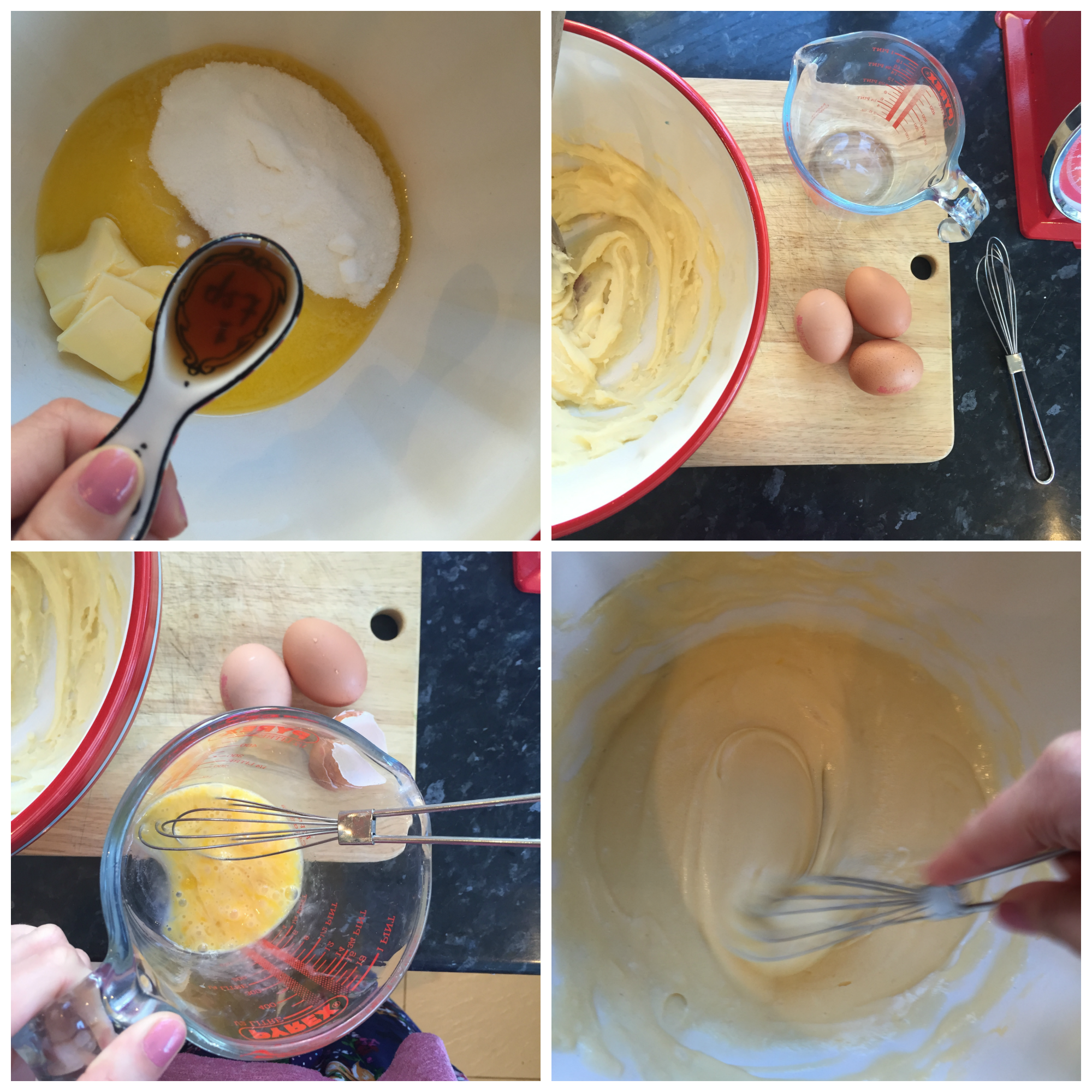 First beat the butter, sugar and vanilla together in a bowl until pale and fluffy. In a separate bowl or jug whisk one egg at a time and add to the mixture, whisking as you go. If the mixture starts to curdle add a spoonful of the flour.