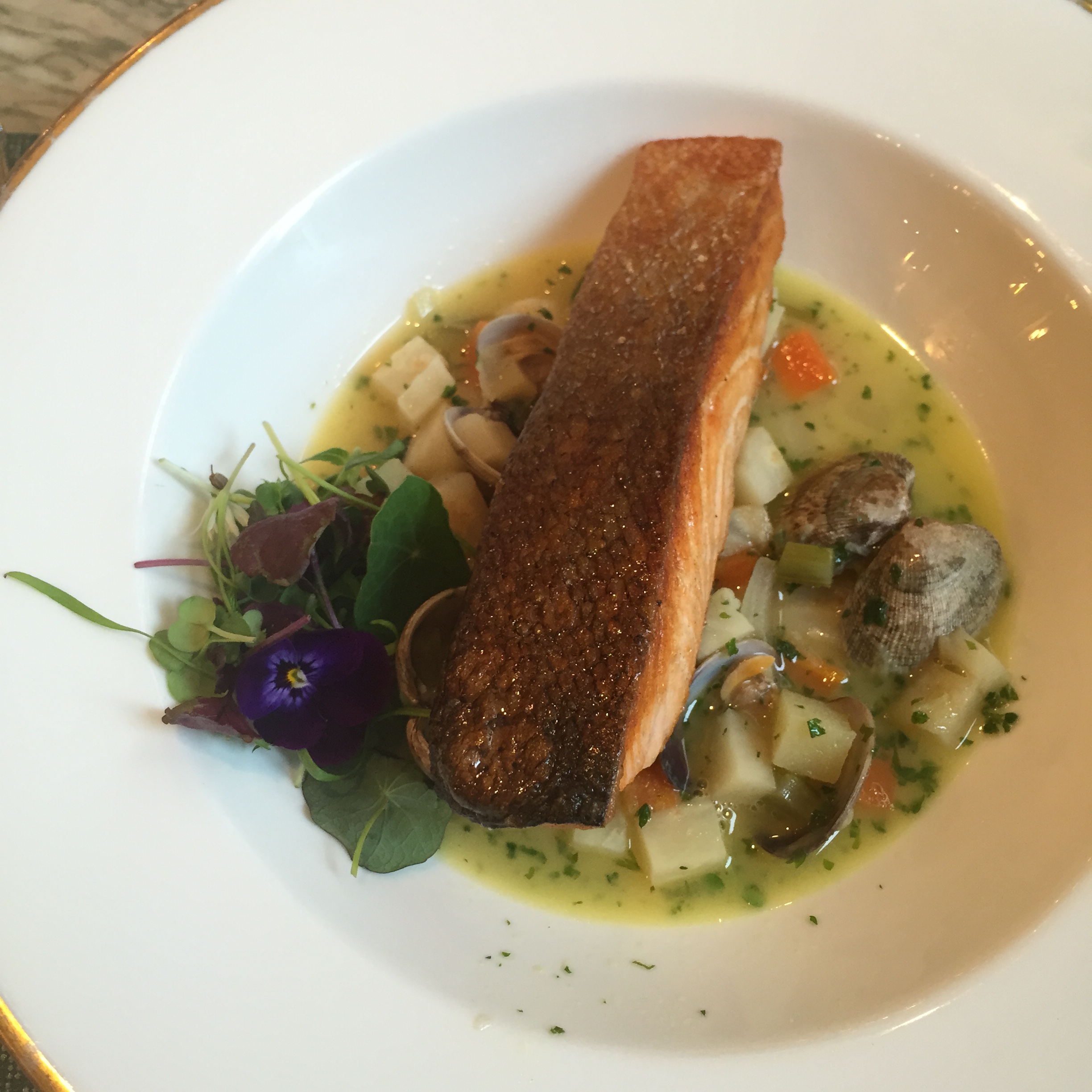 I’m able to keep the next part of this review short and sweet as my dining partner and I both chose the same main course of Loch Duart Salmon and Chocolate Fondant for dessert. The salmon arrived skin-side up in a deep plate which held a cloudy clam broth and cubed vegetables. Decorated with a green leaf garnish and an edible viola, it was beautifully presented. The taste was out of this world – it was no doubt one of the best salmon dishes I have ever had. The crispy salmon skin was delicious and the scattering of clams added another texture to the dish.