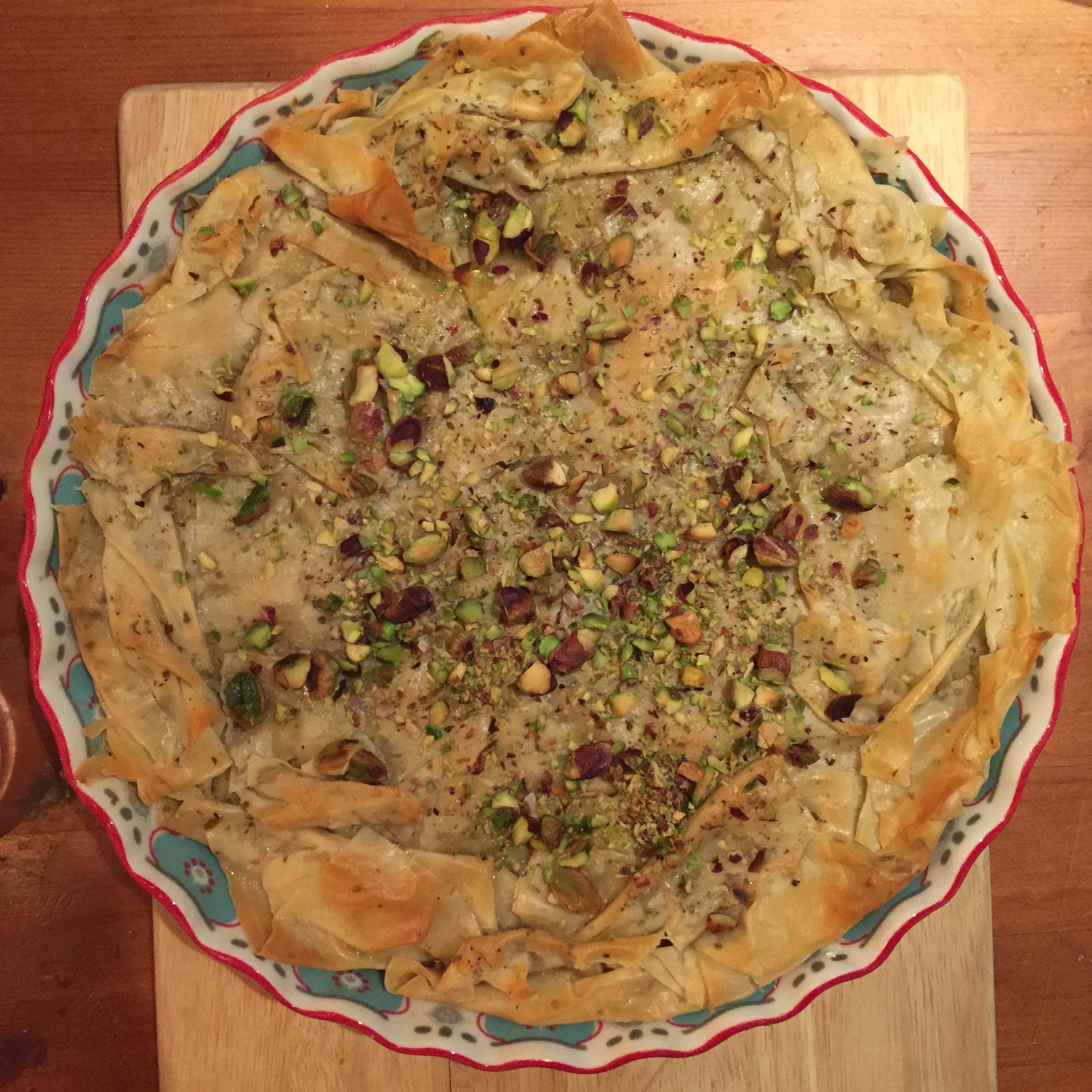Repeat step 8 for the remaining sheets of filo pastry and then push it down on top of the filling. Brush the top with another layer of butter and sprinkle with the remaining pistachios. Bake for 12-15 minutes, until the top is crisp and golden and the middle is hot.