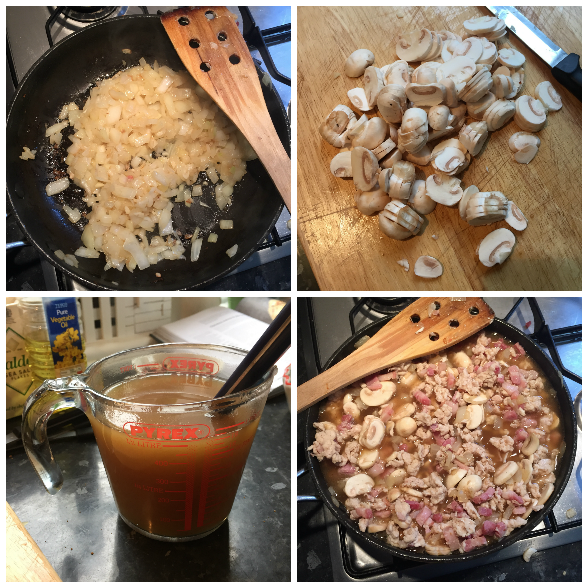 Tip in the mushrooms and the cooked mince. Cover with chicken stock and bring to the boil. Turn the heat down to simmer and cook until the sauce reduces and thickens. The recipe recommends 10-15 minutes but it took us longer, as it depends on the type of pan you use.