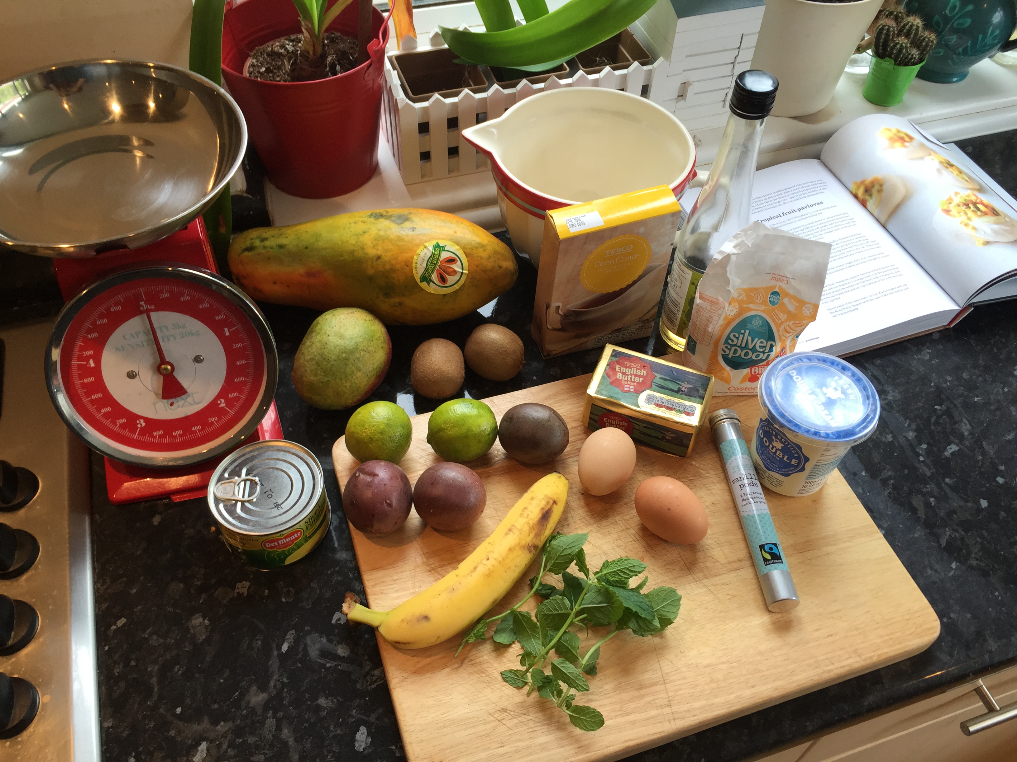 Now that your meringues and cream are ready to go, it’s time to prepare the tropical fruits. Cut the kiwi, mangoes, papaya, banana and pineapple into 5mm dice and mix together in a large bowl. Cut the passion fruit in half and scrape the seeds into the bowl with a teaspoon. Add the lime juice and zest and stir. Sprinkle over the mint and mix it all together.