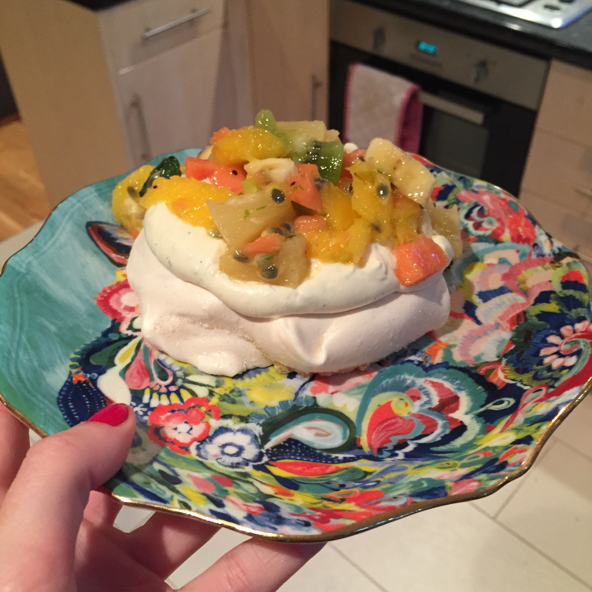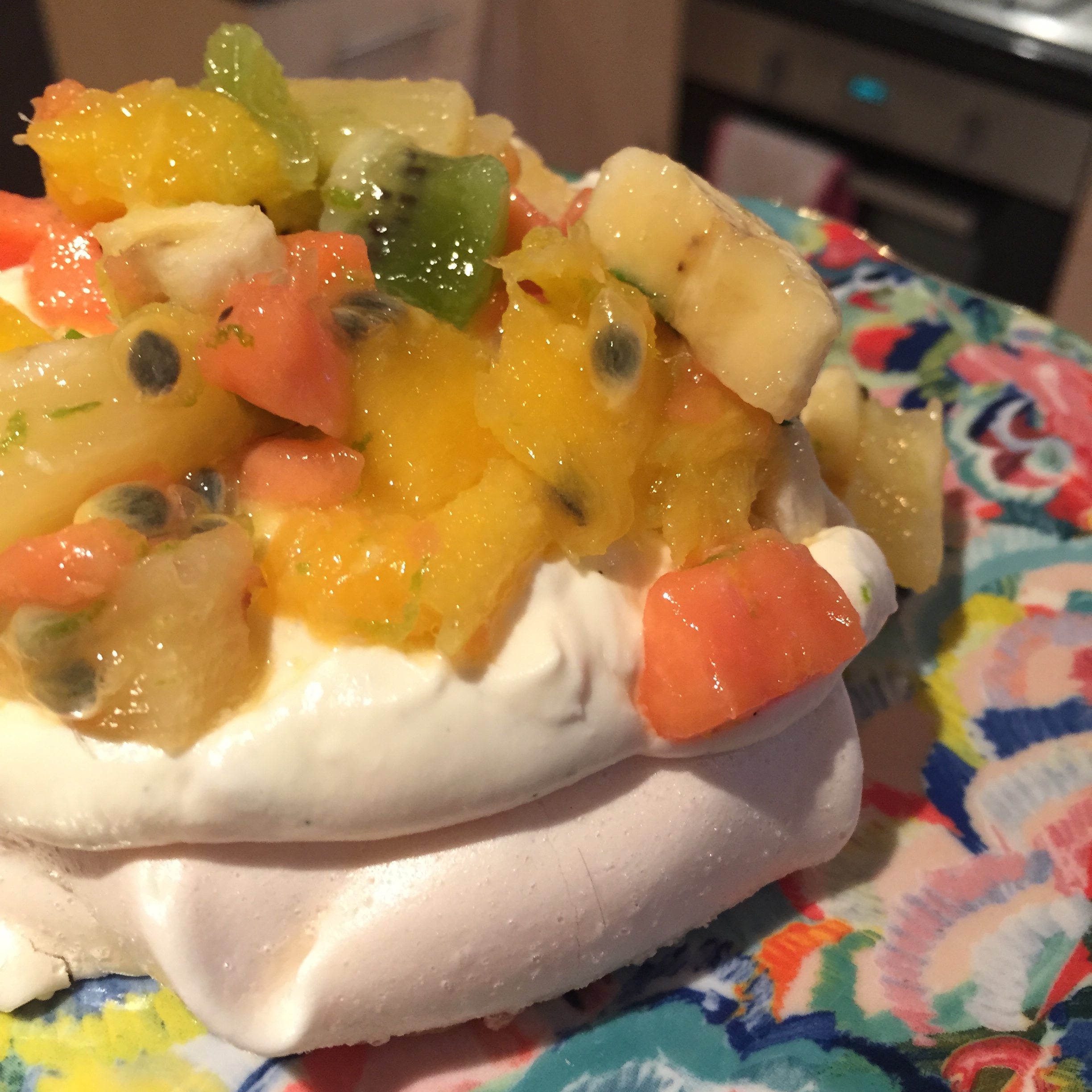 To serve, spoon a dollop of rum cream on top of the meringues and add the diced fruits. And now it’s time to enjoy this totally tropical fruity delight!