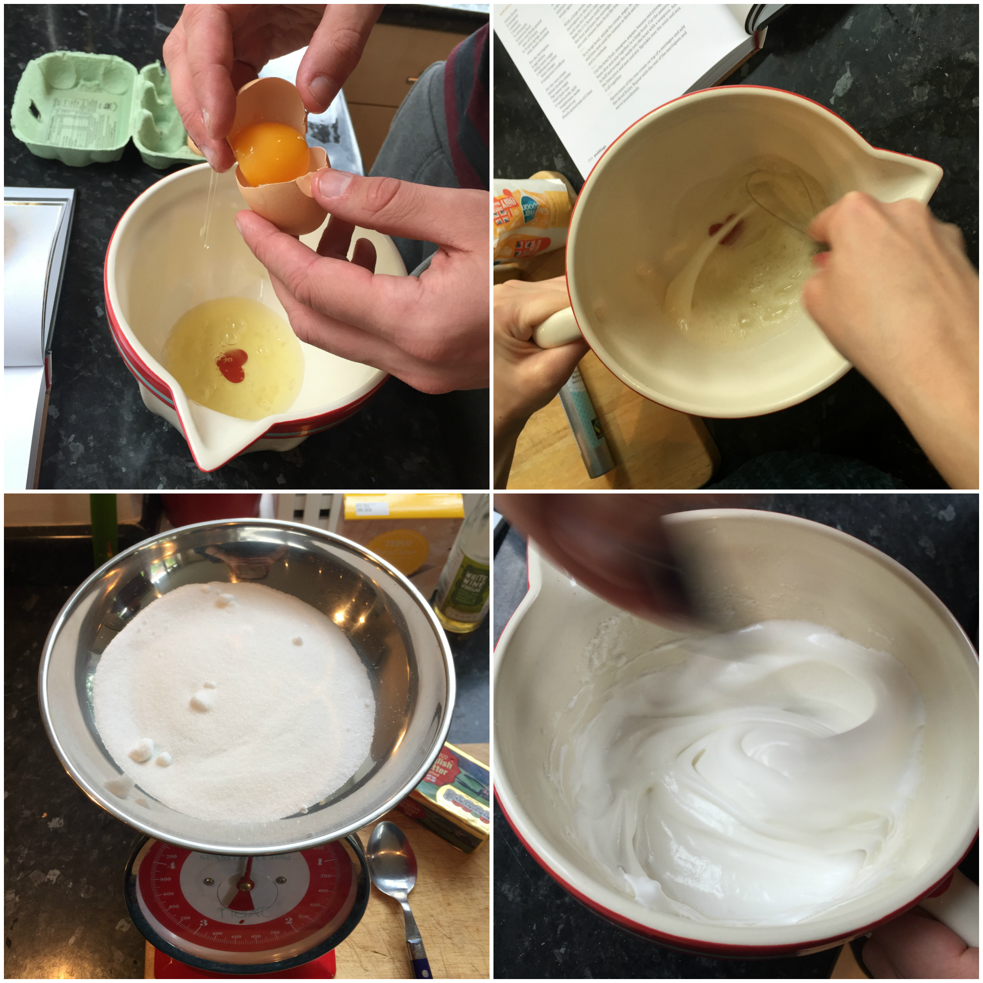 Put the egg whites into a clean bowl and whisk until they reach soft peaks. Add the caster sugar a spoonful at a time, whisking well after each addition. When the mixture is glossy and thick add the vinegar and cornflour before whisking again to incorporate.