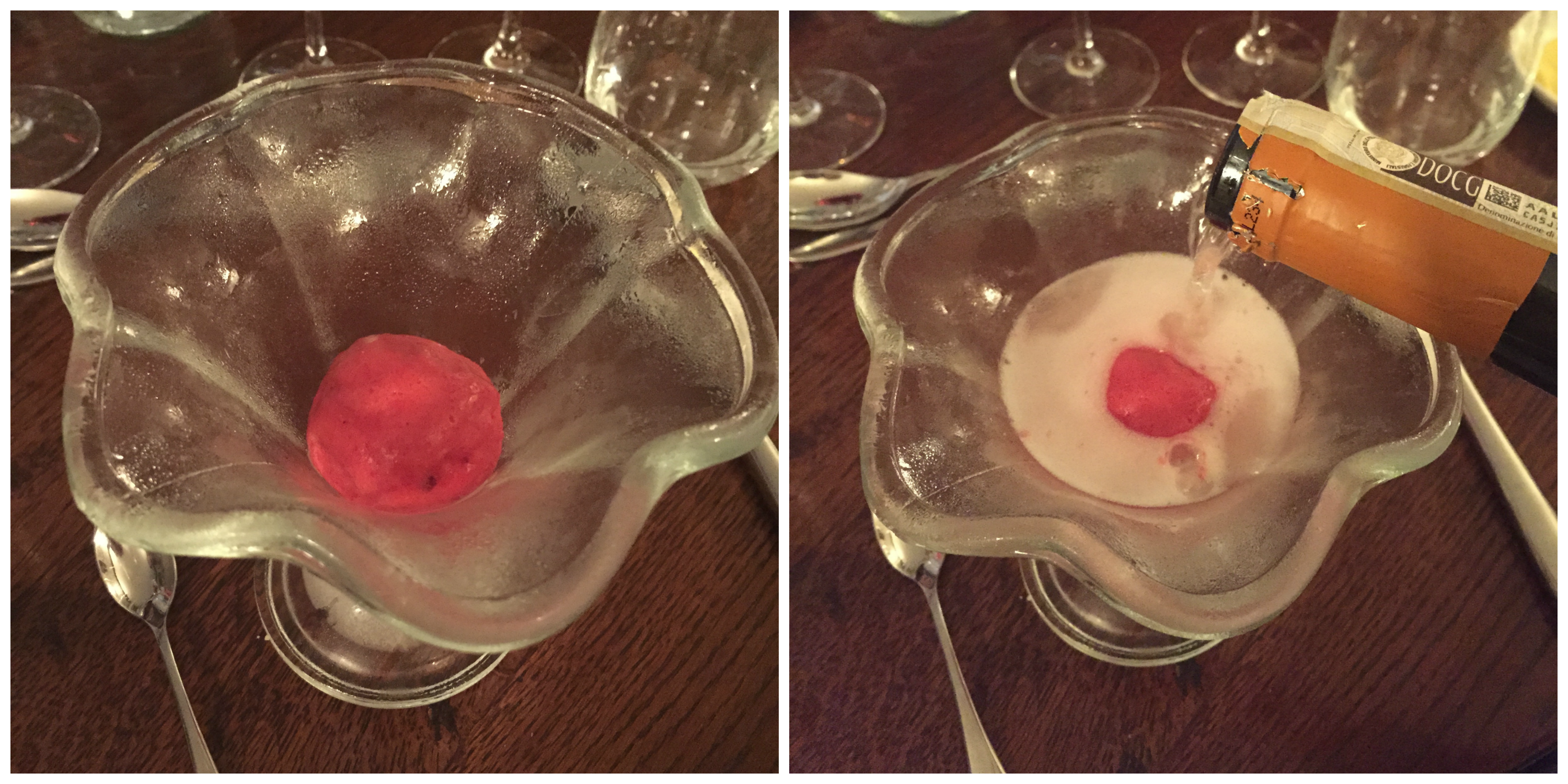 We were presented with a palate cleanser or Trou Normande as the menu read. Trou Normand is the northern French tradition of a small drink of brandy, usually Calvados, between courses to settle the stomach and reawaken the palate. We enjoyed a pink sorbet and bubbles before a final savoury course and pudding.