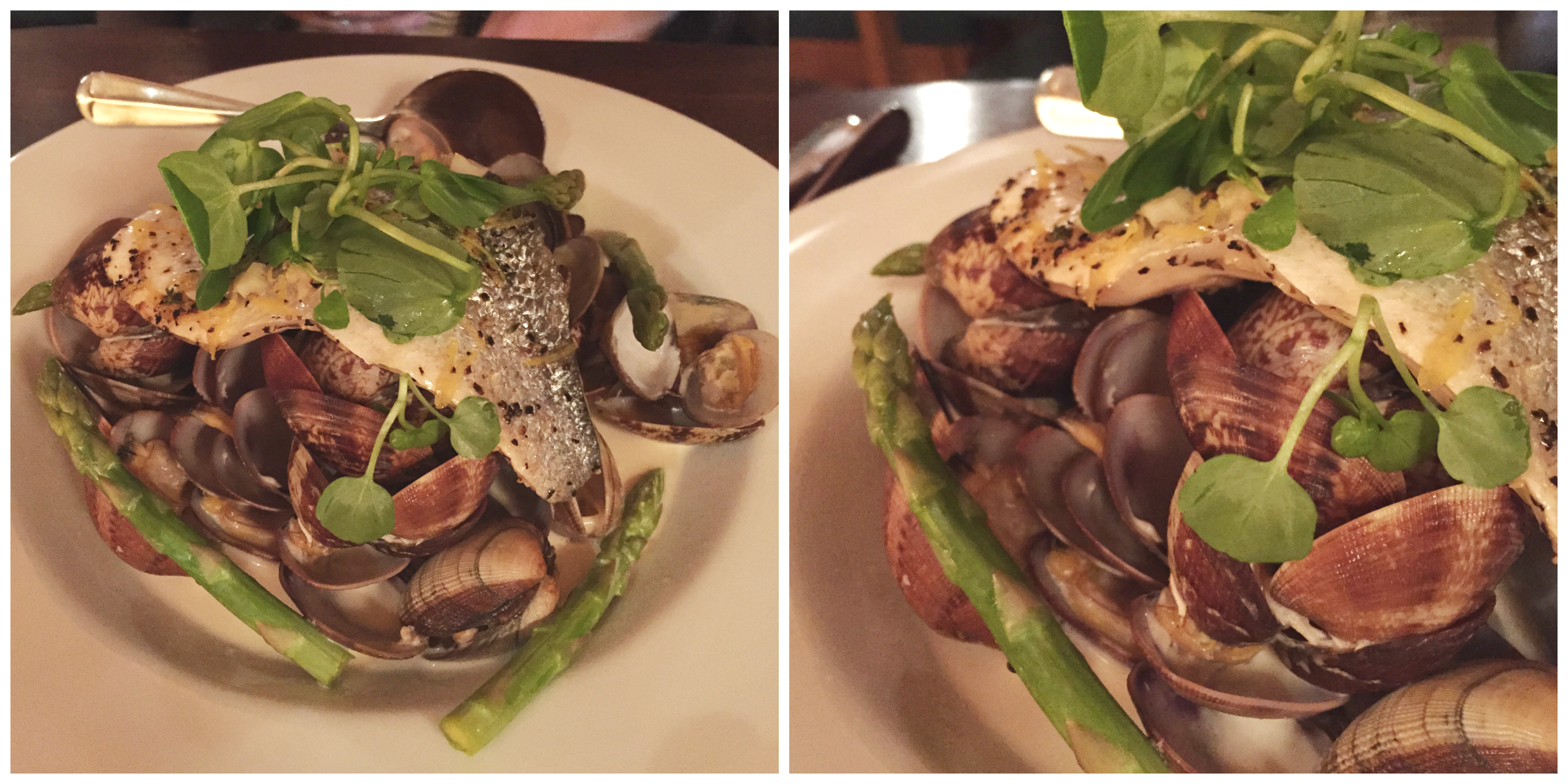 The baked sea bream served with clams in white wine butter and pickled asparagus was an impressive plate. A mountain of clams acted as a throne for the fresh sea bream which was perfectly baked.
