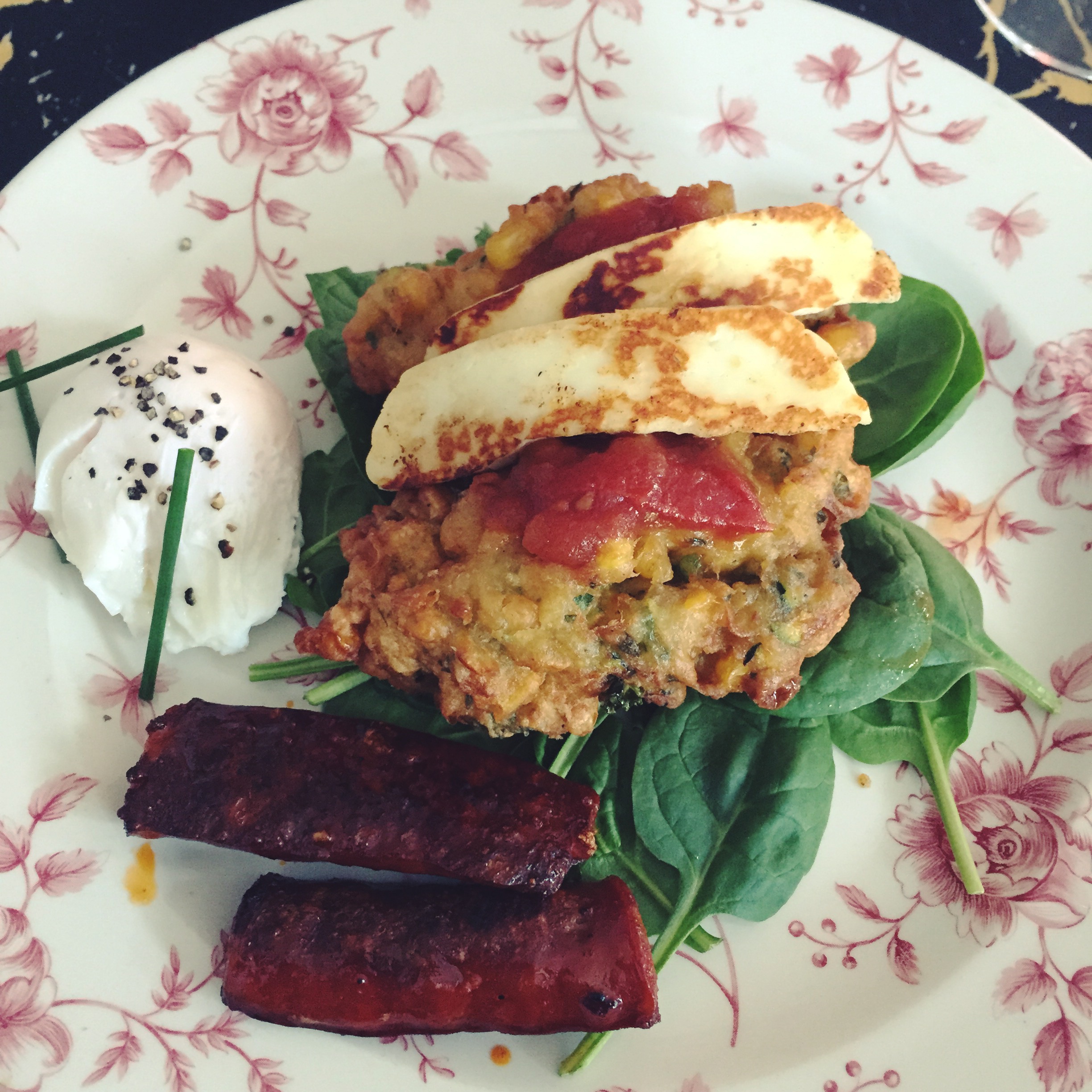 I went veggie (almost) opting for the Sweet Corn & Courgette Fritters with halloumi, balsamic roast tomato chutney and a poached egg. I cheekily added chorizo which brought a bit of spice to the otherwise fresh and summery dish.