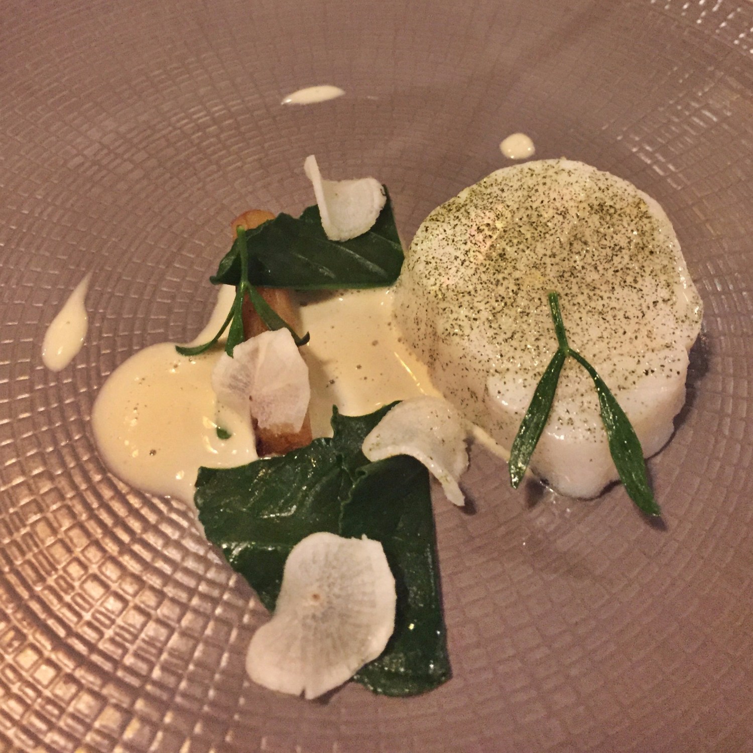Next on the menu was Ika and dashi, this was going to be a surprise since I hadn’t a clue what either ingredient was. It turns out Ika is in fact squid which was served raw, chopped up like a tartare. It was wrapped in dashi which is a type of stock that forms the base of miso soup or noodle broth, in this dish it was presented as a jelly. The plate was delicate and textural.